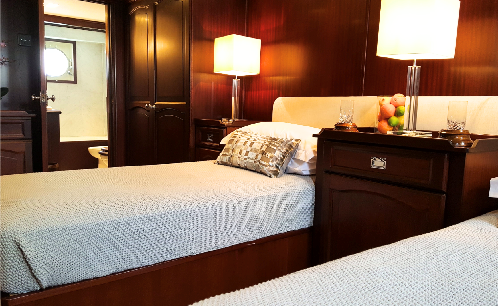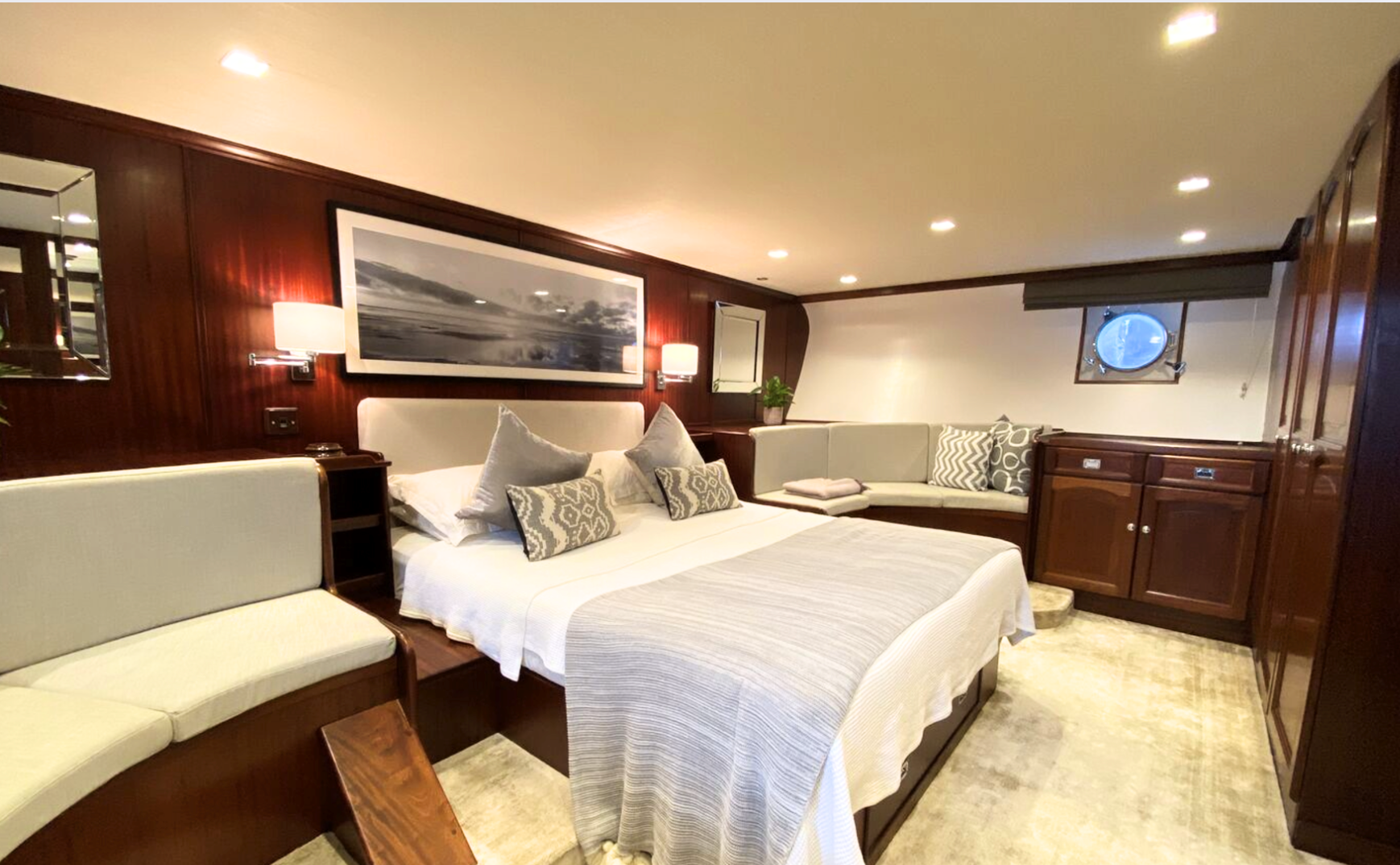 She accommodates up to 10 guests, featuring a full-beam master suite aft, a twin cabin to port, a double cabin to starboard, a VIP suite midships, and an owner’s suite on the main deck. The yacht also offers three dining areas—both indoor and outdoor—as well as a sheltered lounge for relaxed open-air gatherings.