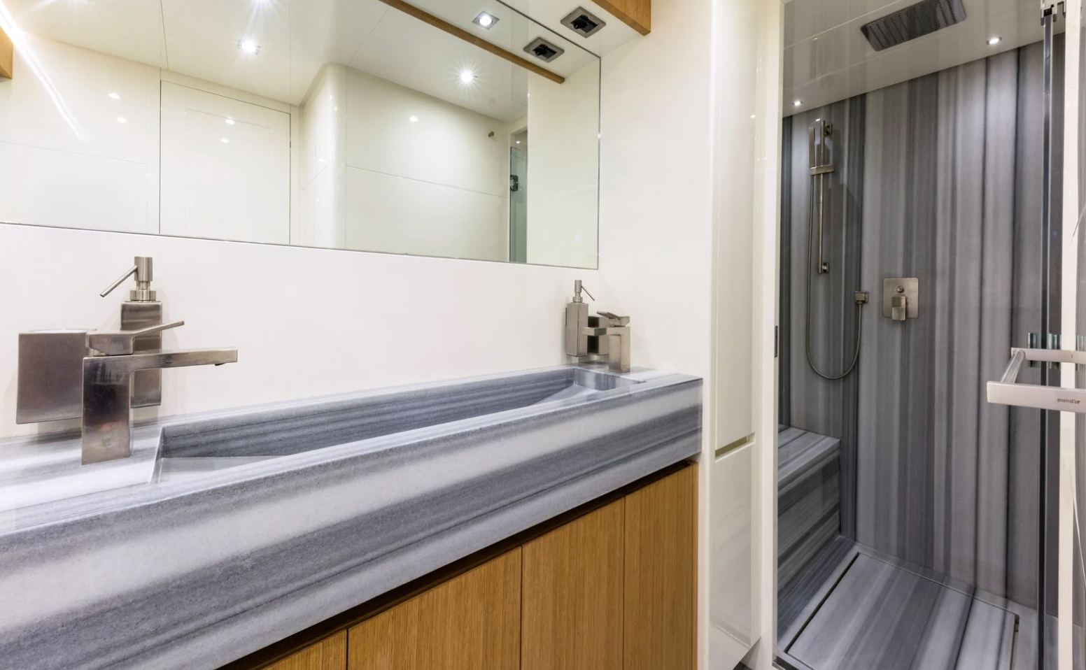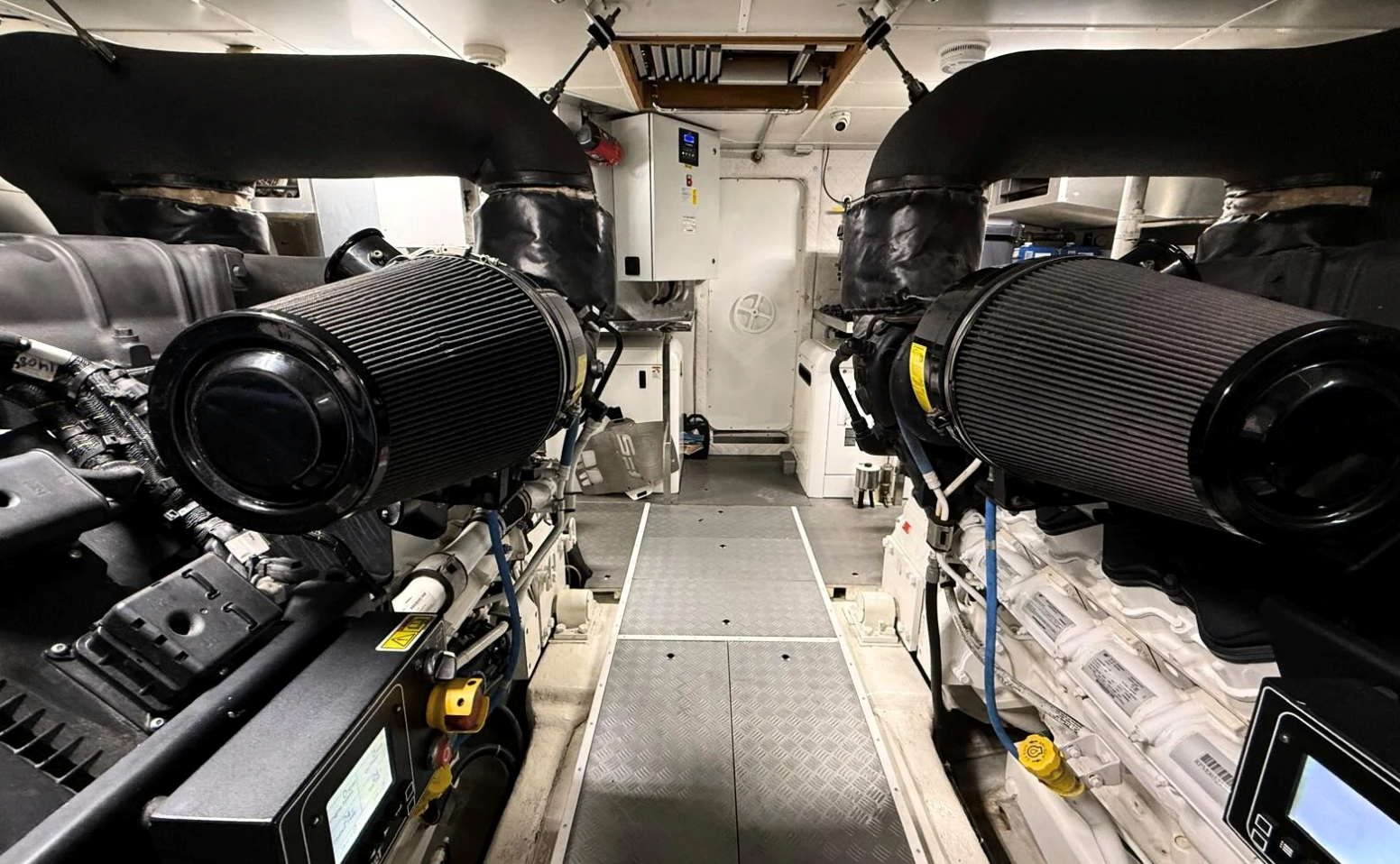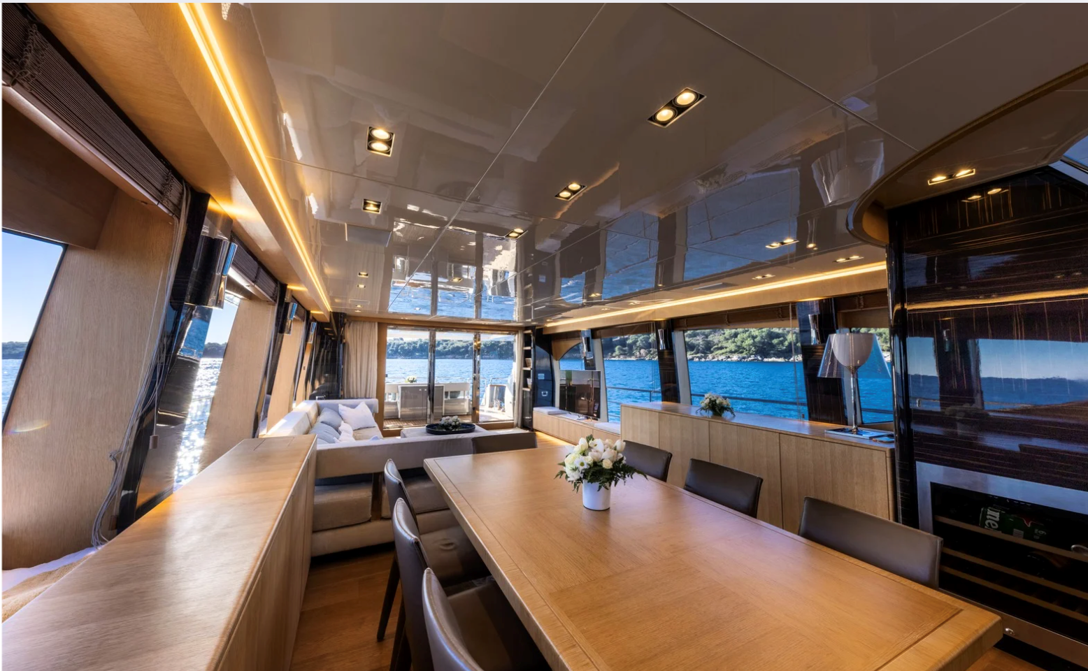 The 2018 Canados 888 is a refined flybridge yacht combining strong performance with efficient design. Built on a proven Canados platform, her stepped hull ensures smooth handling and fuel efficiency. The main salon features floor-to-ceiling windows and full-beam retractable doors, creating a bright, open living space that connects seamlessly to the aft deck. A lacquered ceiling and open galley layout enhance practicality and light throughout. A main-deck day head adds convenience for guests.