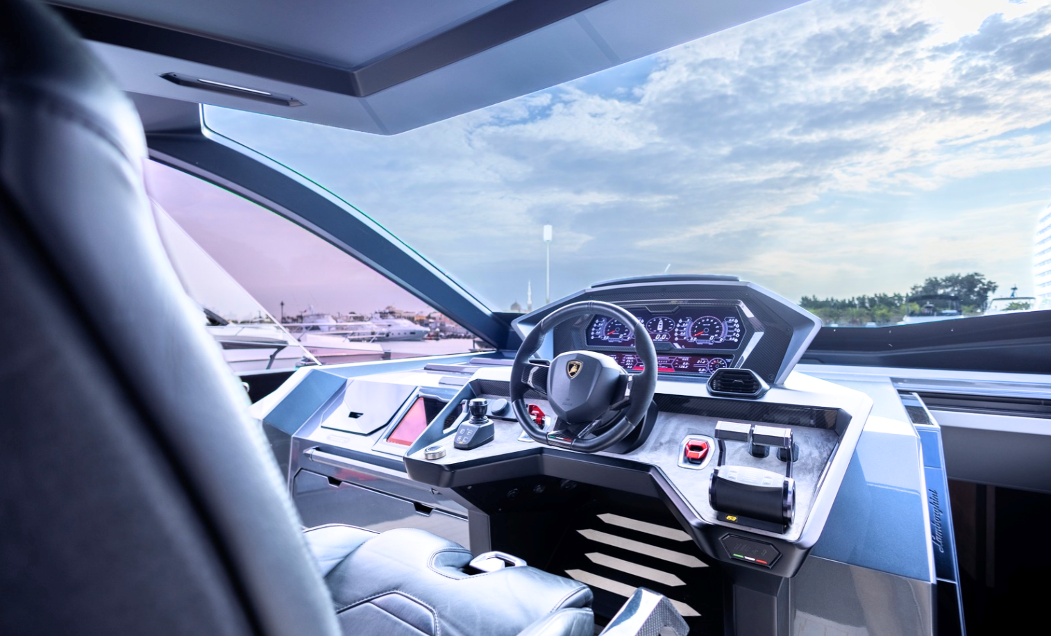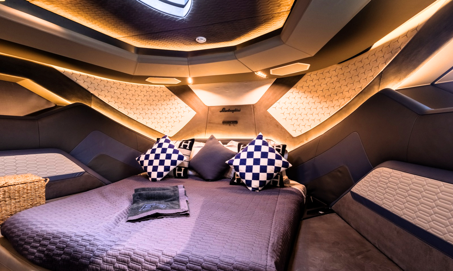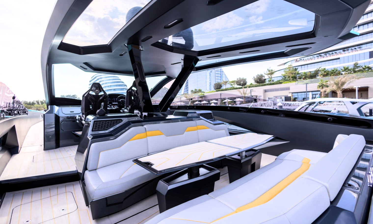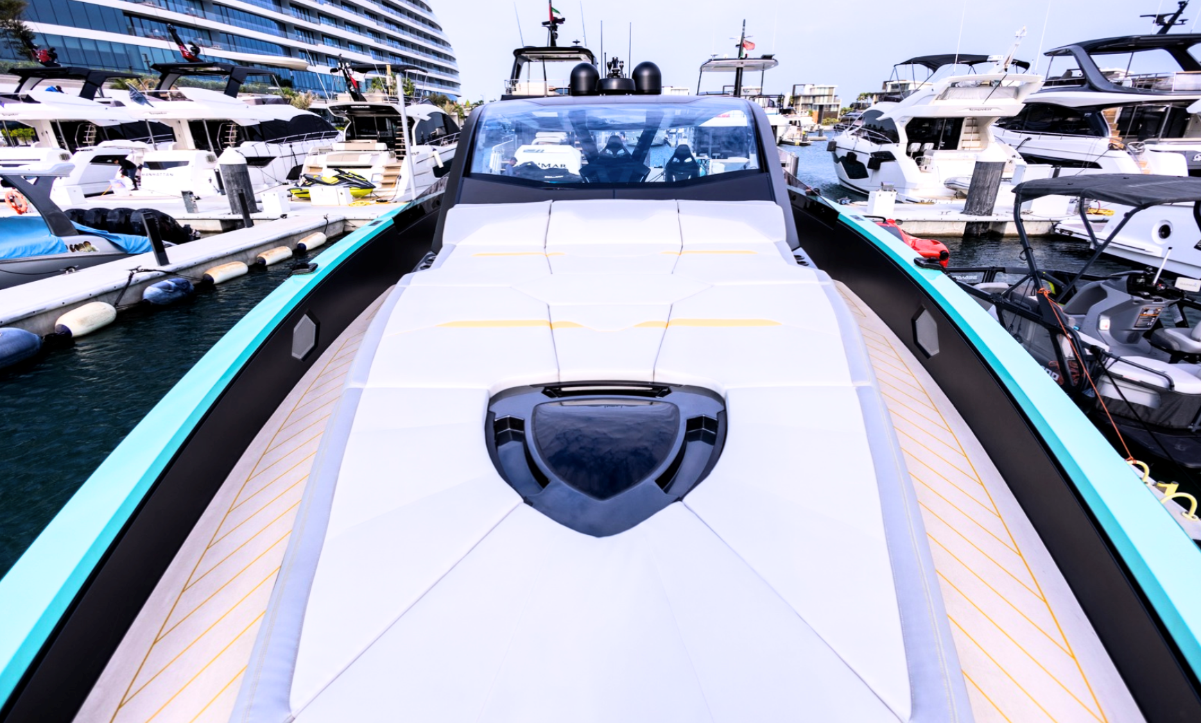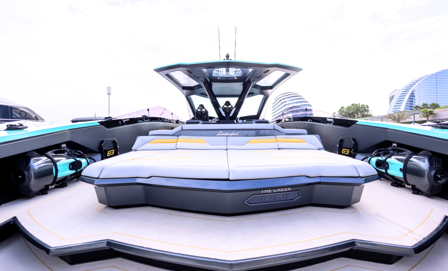 Notable features include a Seakeeper stabilizer, Webasto air conditioning, Apple TV, and a Crestron sound system. The yacht also comes equipped with two SeaBobs, a full galley, and multiple sun-lounging areas. The foredeck, cockpit, and aft sunpads provide spacious open-air zones for relaxing or entertaining. Finished in Lamborghini’s signature angular style, this yacht delivers on performance, design, and everyday usability.