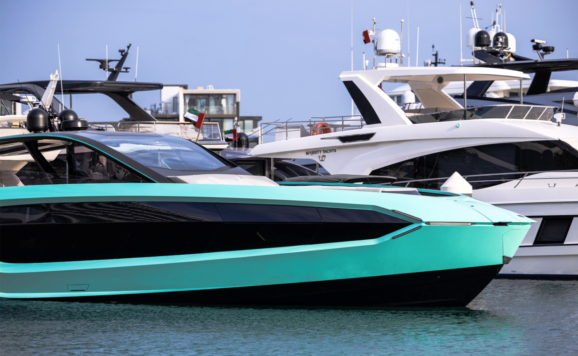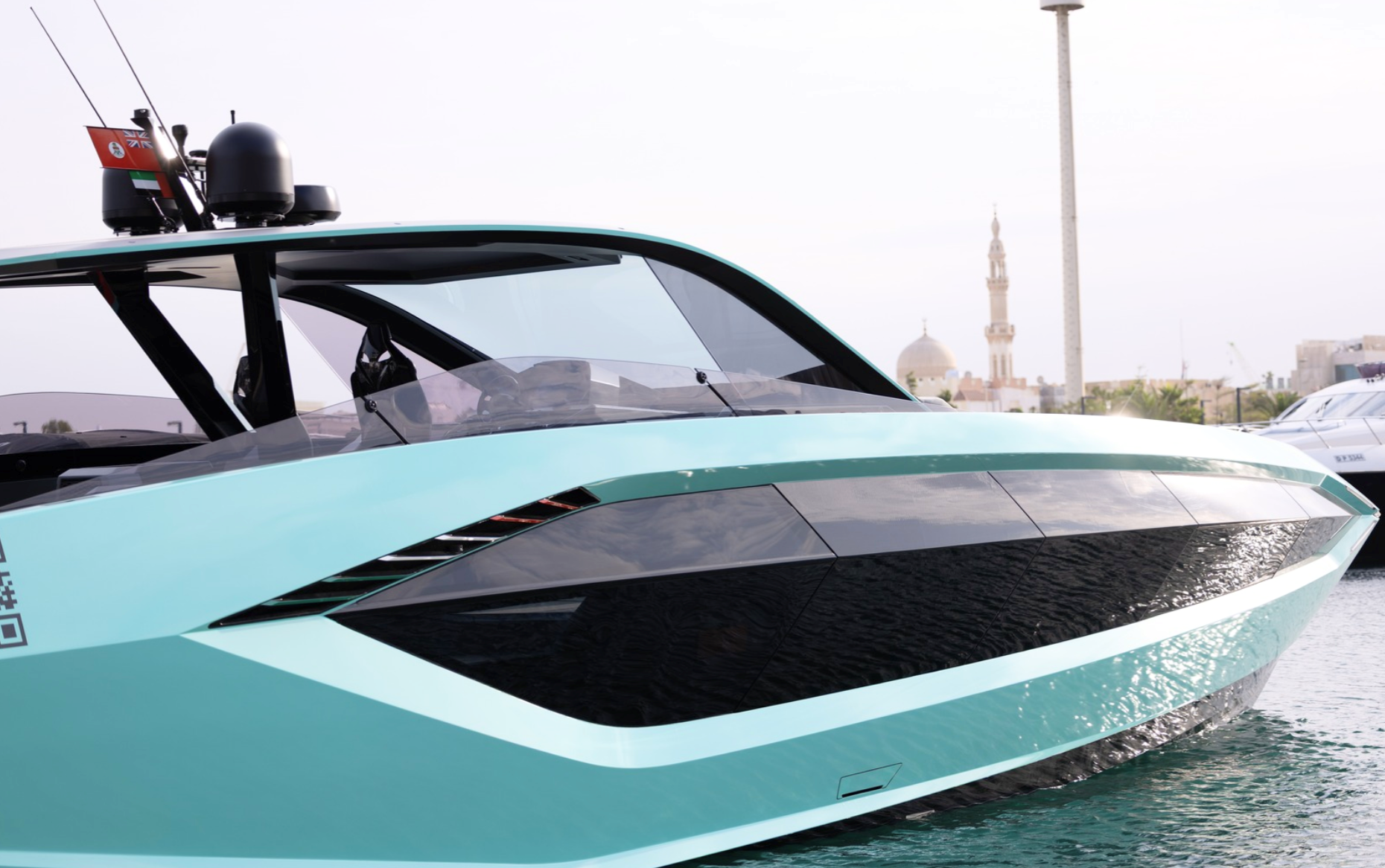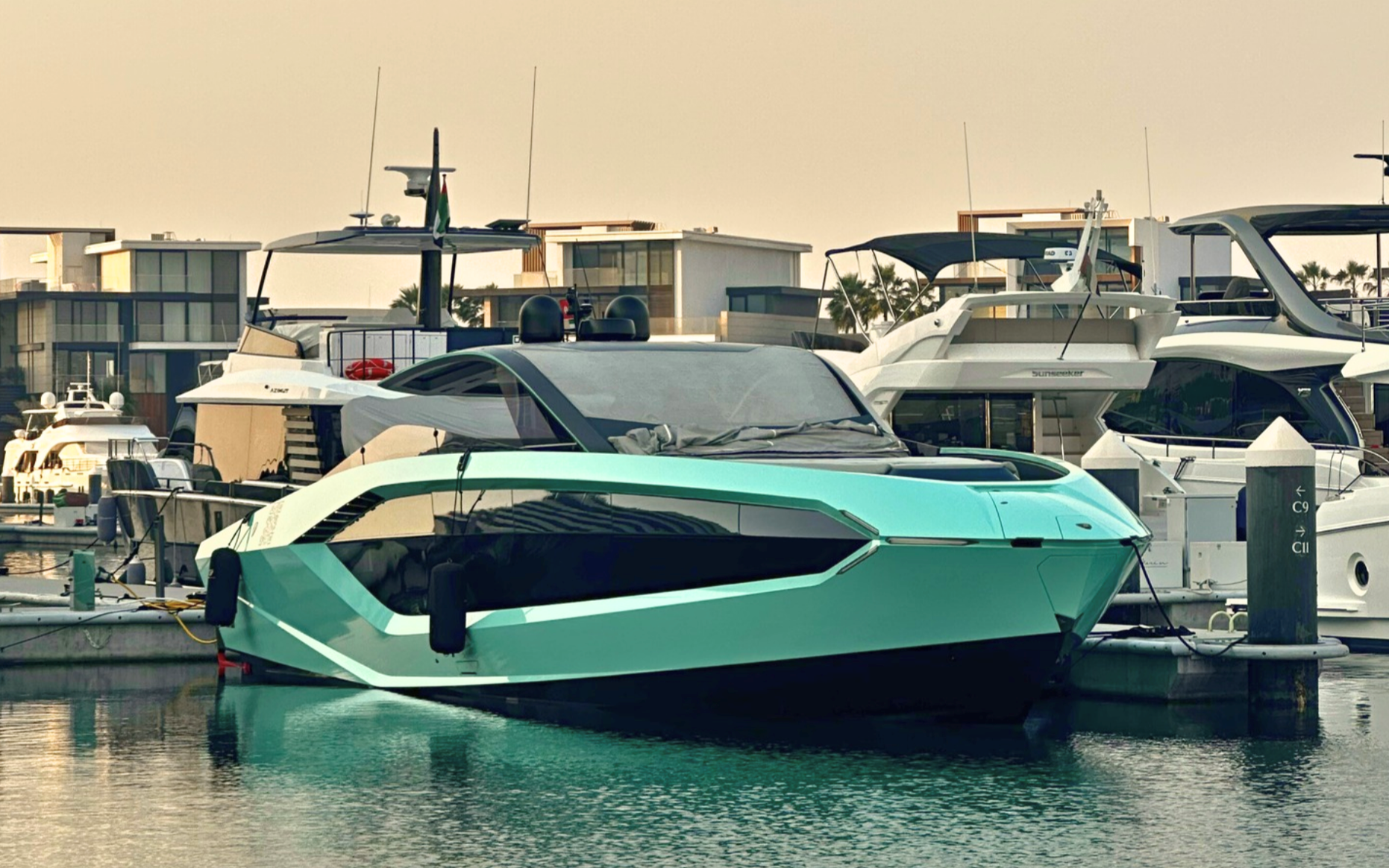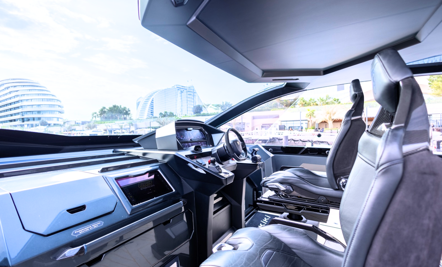 Notable features include a Seakeeper stabilizer, Webasto air conditioning, Apple TV, and a Crestron sound system. The yacht also comes equipped with two SeaBobs, a full galley, and multiple sun-lounging areas. The foredeck, cockpit, and aft sunpads provide spacious open-air zones for relaxing or entertaining. Finished in Lamborghini’s signature angular style, this yacht delivers on performance, design, and everyday usability.