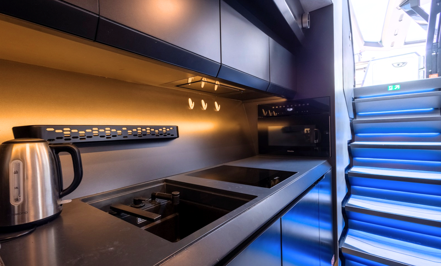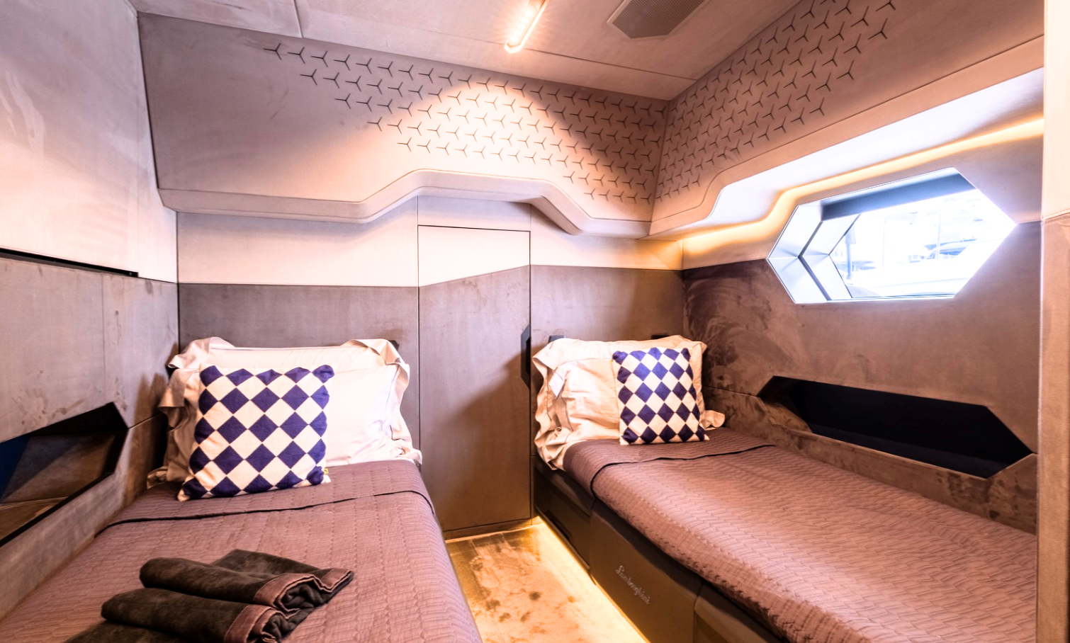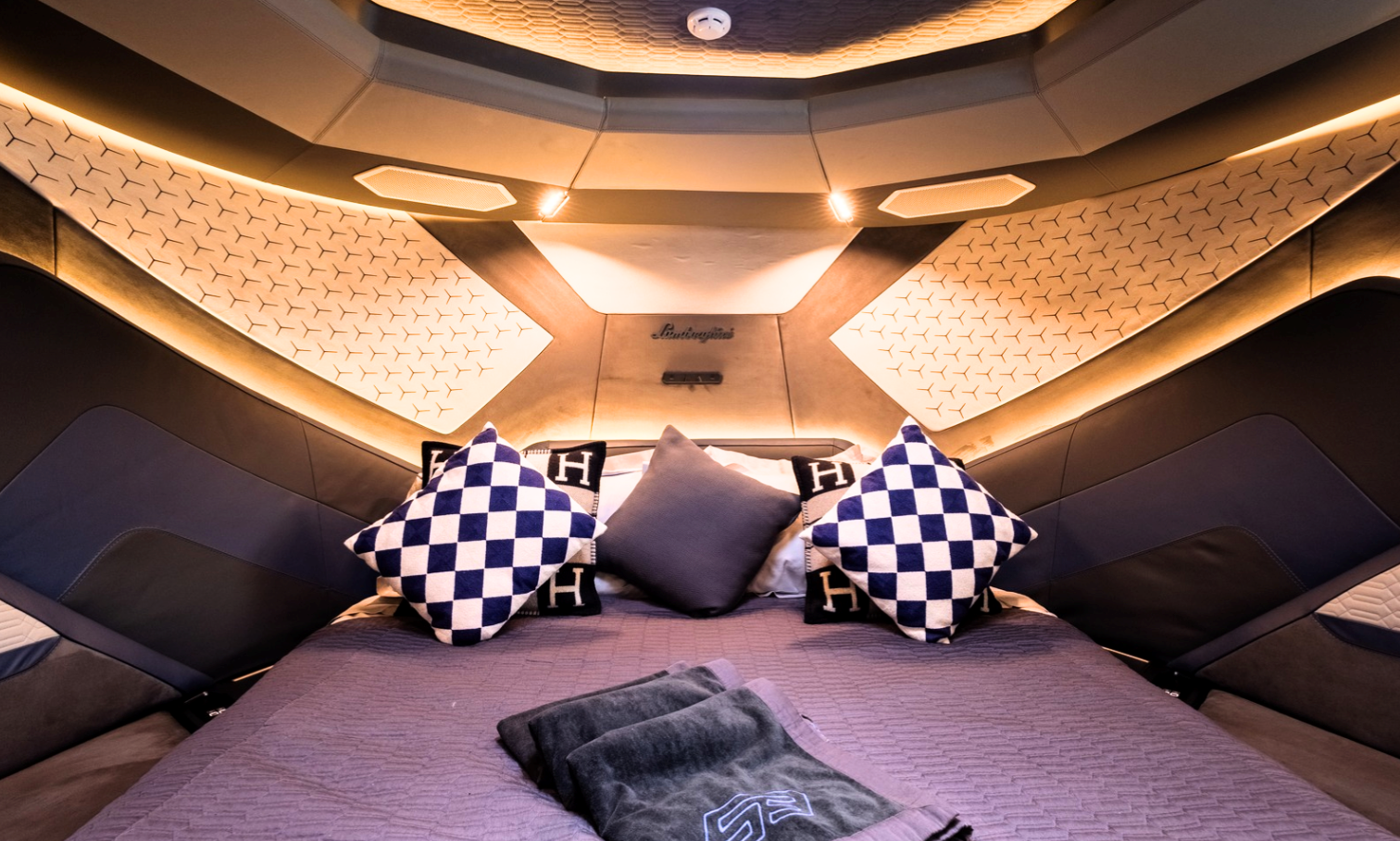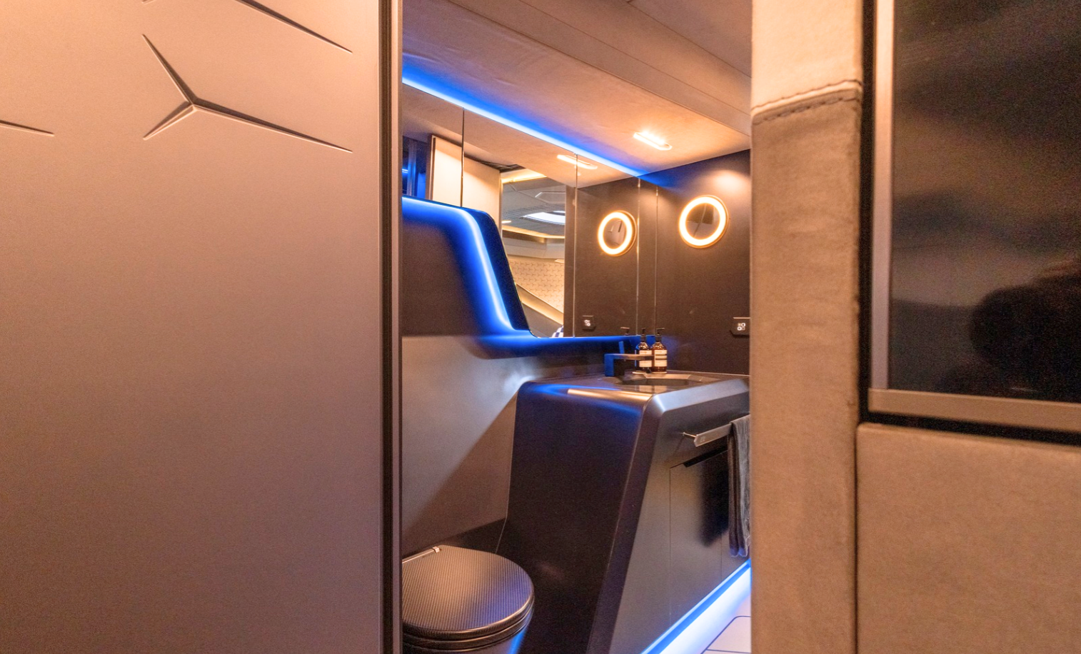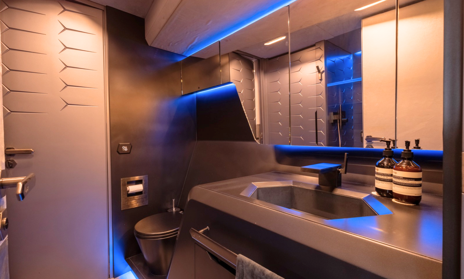 Notable features include a Seakeeper stabilizer, Webasto air conditioning, Apple TV, and a Crestron sound system. The yacht also comes equipped with two SeaBobs, a full galley, and multiple sun-lounging areas. The foredeck, cockpit, and aft sunpads provide spacious open-air zones for relaxing or entertaining. Finished in Lamborghini’s signature angular style, this yacht delivers on performance, design, and everyday usability.