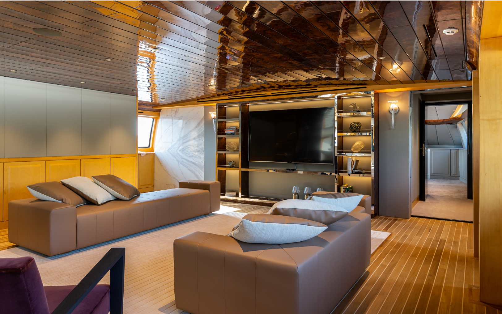She has a unique construction technique utilising FRP and teak planks on the hull and superstructures, has a 10.56m beam and a 2m draft. The max speed is 18 knots and she can comfortably accommodate 12 guests in her 6 luxurious cabins. With a stylish and comfortable main living room, the owner has spared no expense when it comes to the high end Italian furnishings and systems onboard.