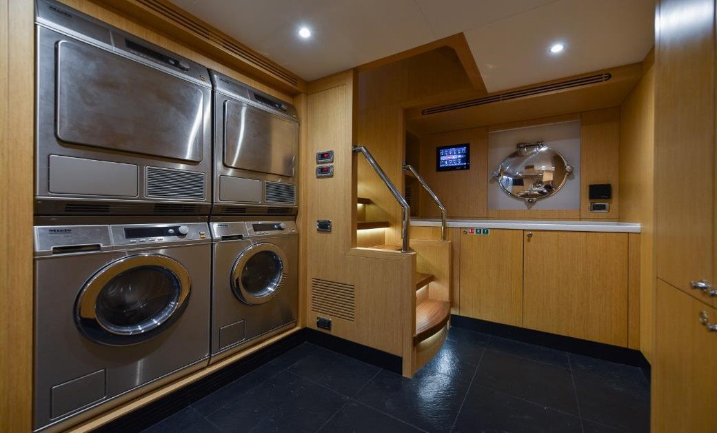 The layouts of her main deck, upper deck, and fly-bridge have all been specifically designed to enable guests and hosts to easily mingle while her on-board crew provides catering from her main galley, bars, and barbecue area.