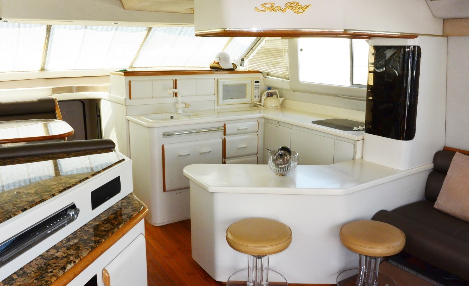 The Sunseeker 116 luxury yacht’s interior has been designed to entertain, with a big main saloon with full-height windows, an entertainment center with a large LED television screen and a stereo surround sound system, as well as a dining area with space for up to 10 guests spread through her 5 staterooms. A full-service bar, a grill, a movie, a gym, and a Jacuzzi on the flybridge are just a few of the yacht’s many amenities for amusement and relaxation. Various water toys, including kayaks, paddleboards and a tender, are also available.