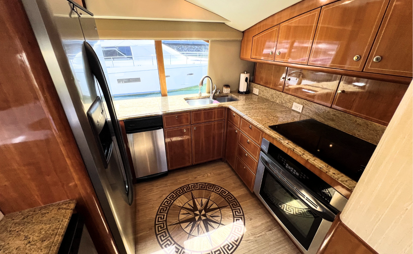 The 2005 Ocean 73 Super Sport is a well-equipped yacht designed for both comfort and functionality. It includes a watermaker producing 800 gallons per day. The electronics have been upgraded, including a FLIR night vision camera, enhancing safety and navigation in low-light conditions. Additionally, the yacht comes with new laundry equipment, providing convenience.