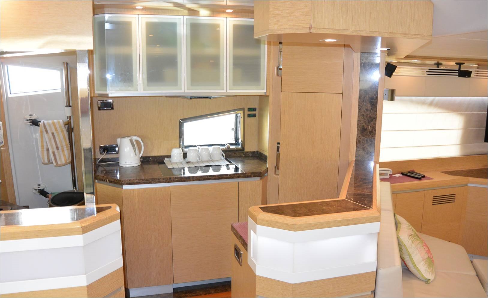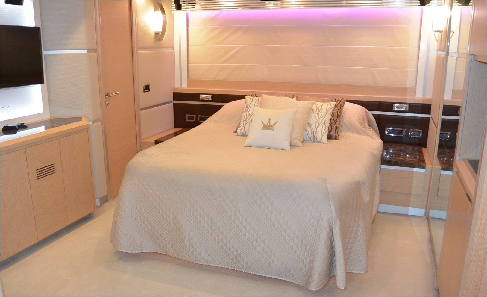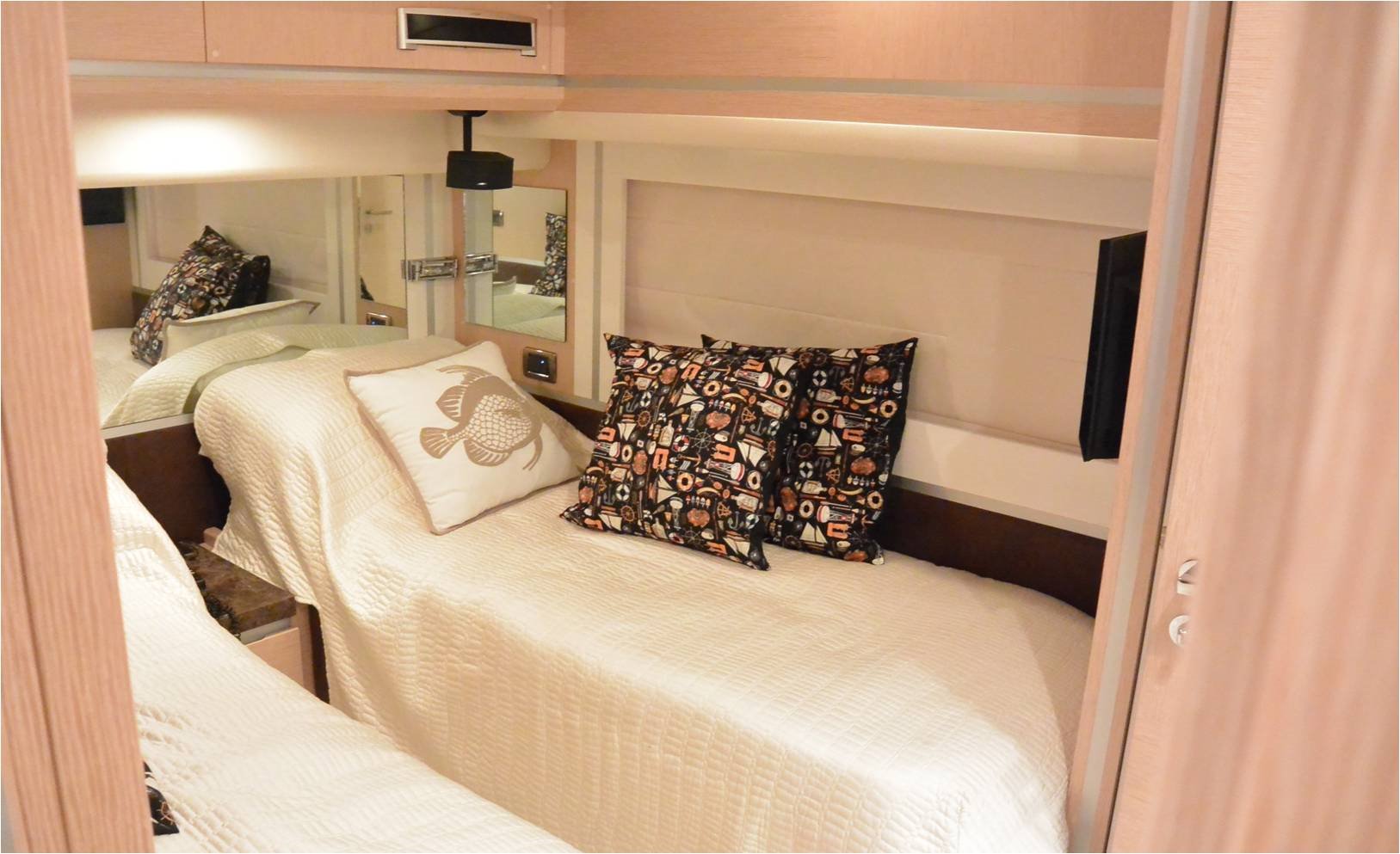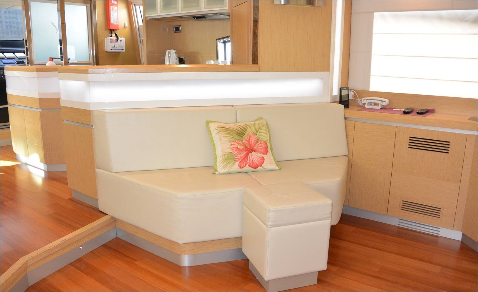 With a high volume interior, the layout features a full beam master cabin, two guest cabins (accommodates 6 overnight guests), and ample entertainment spaces.