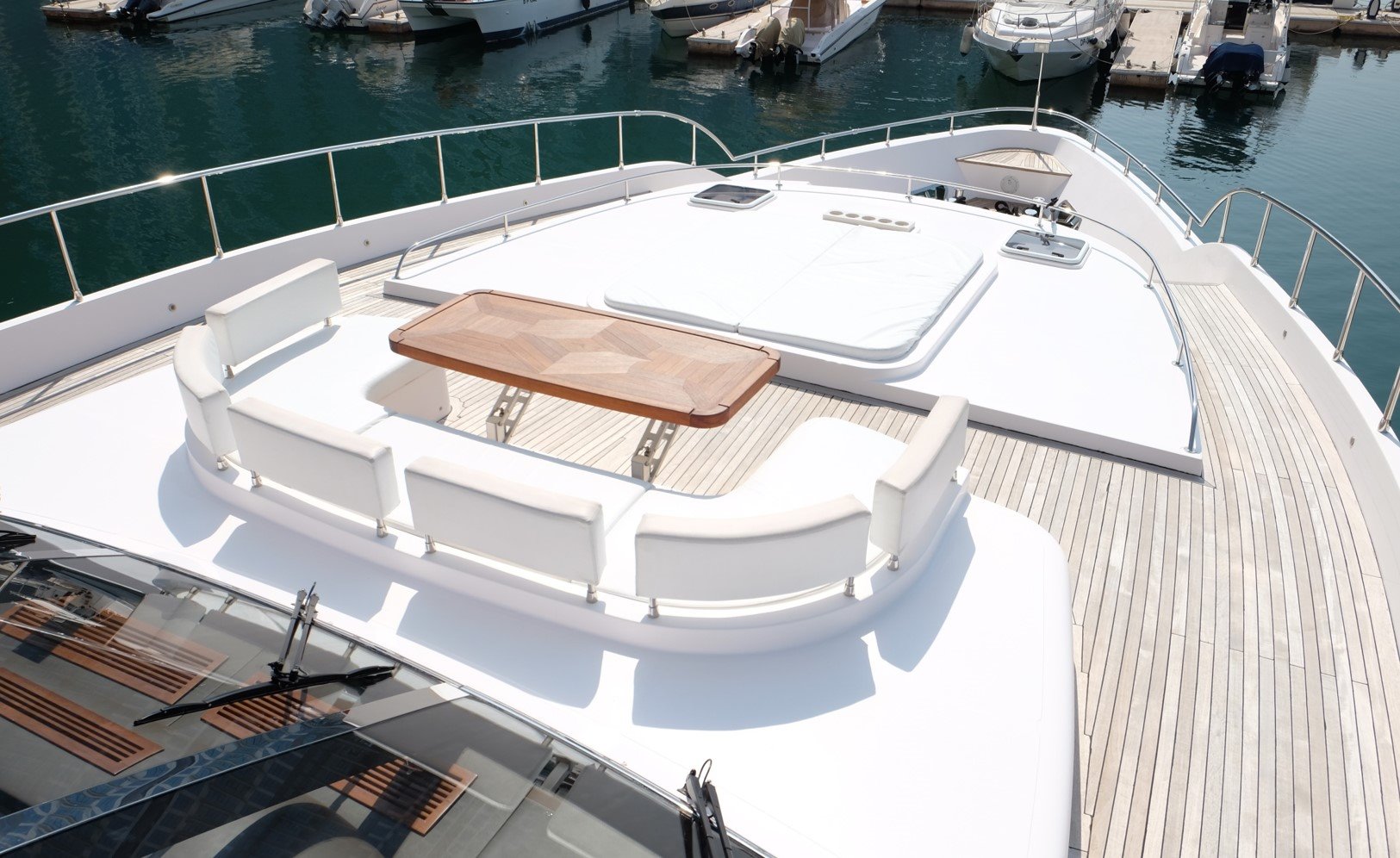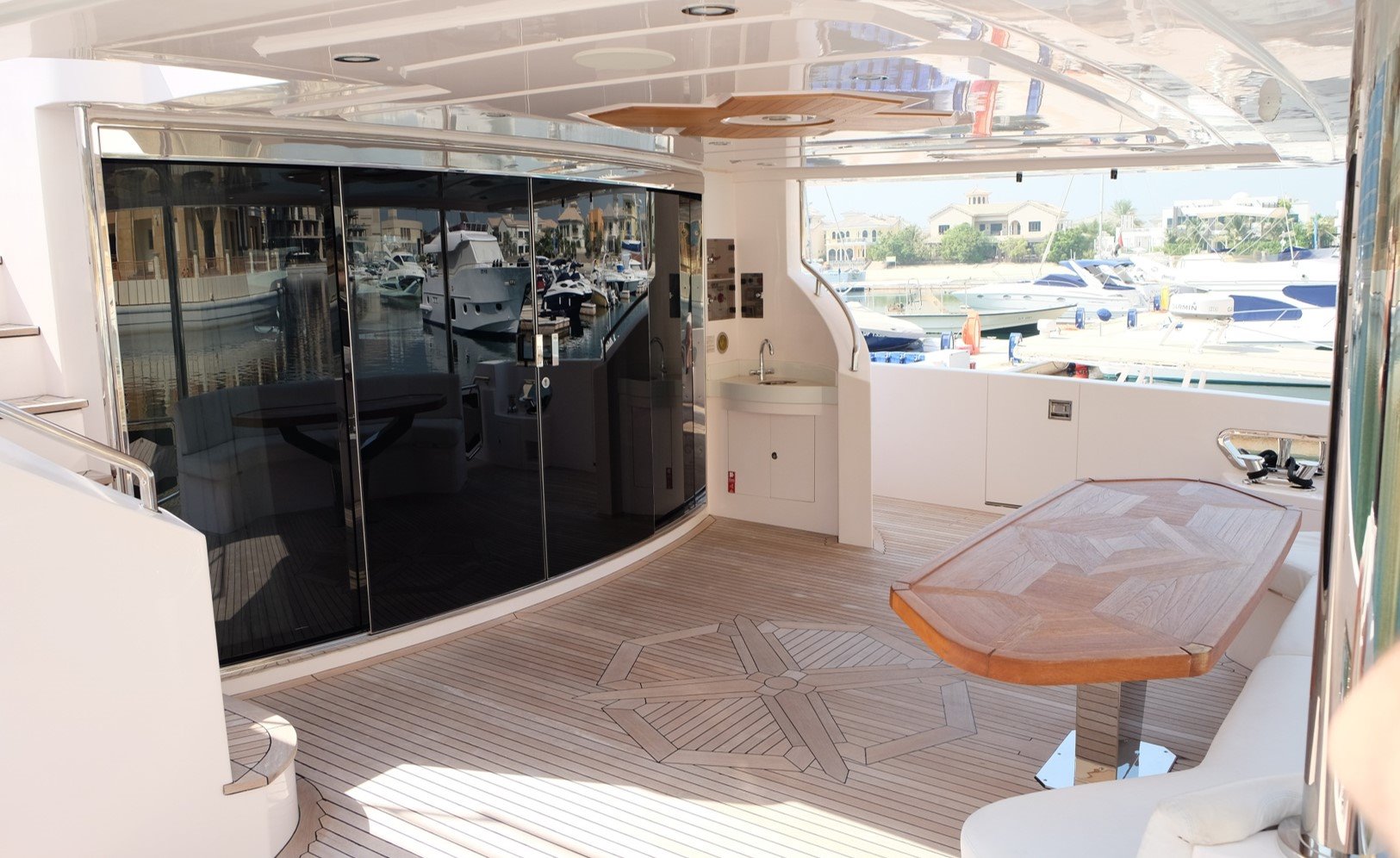 Her main deck offers breathtaking views through intelligently designed large windows, allowing ample natural sunlight to flow through the interior, with an elegantly designed saloon and dining area. Her upper deck area features a sun pad, Jacuzzi, ample seating and wet bar amenities.
