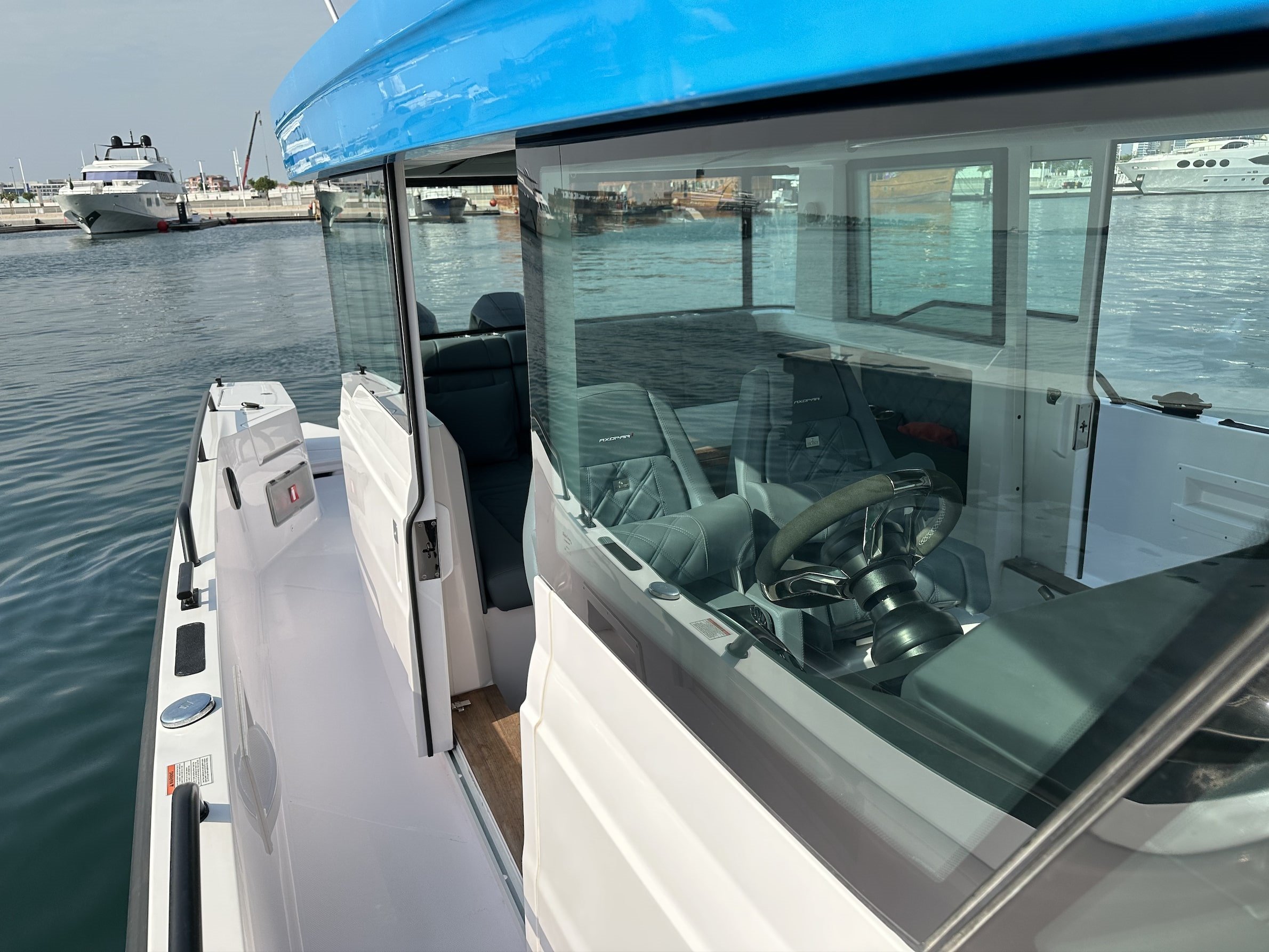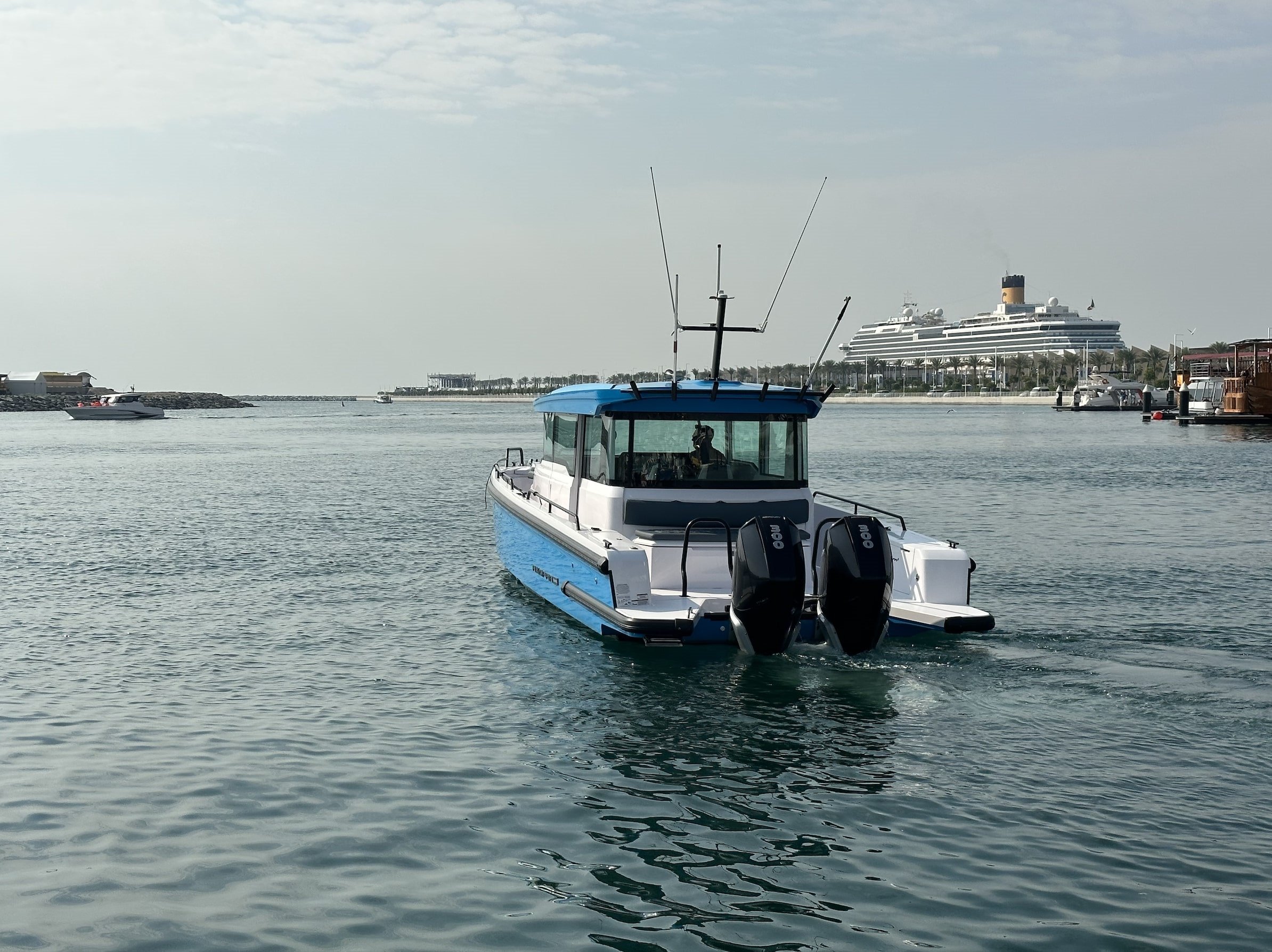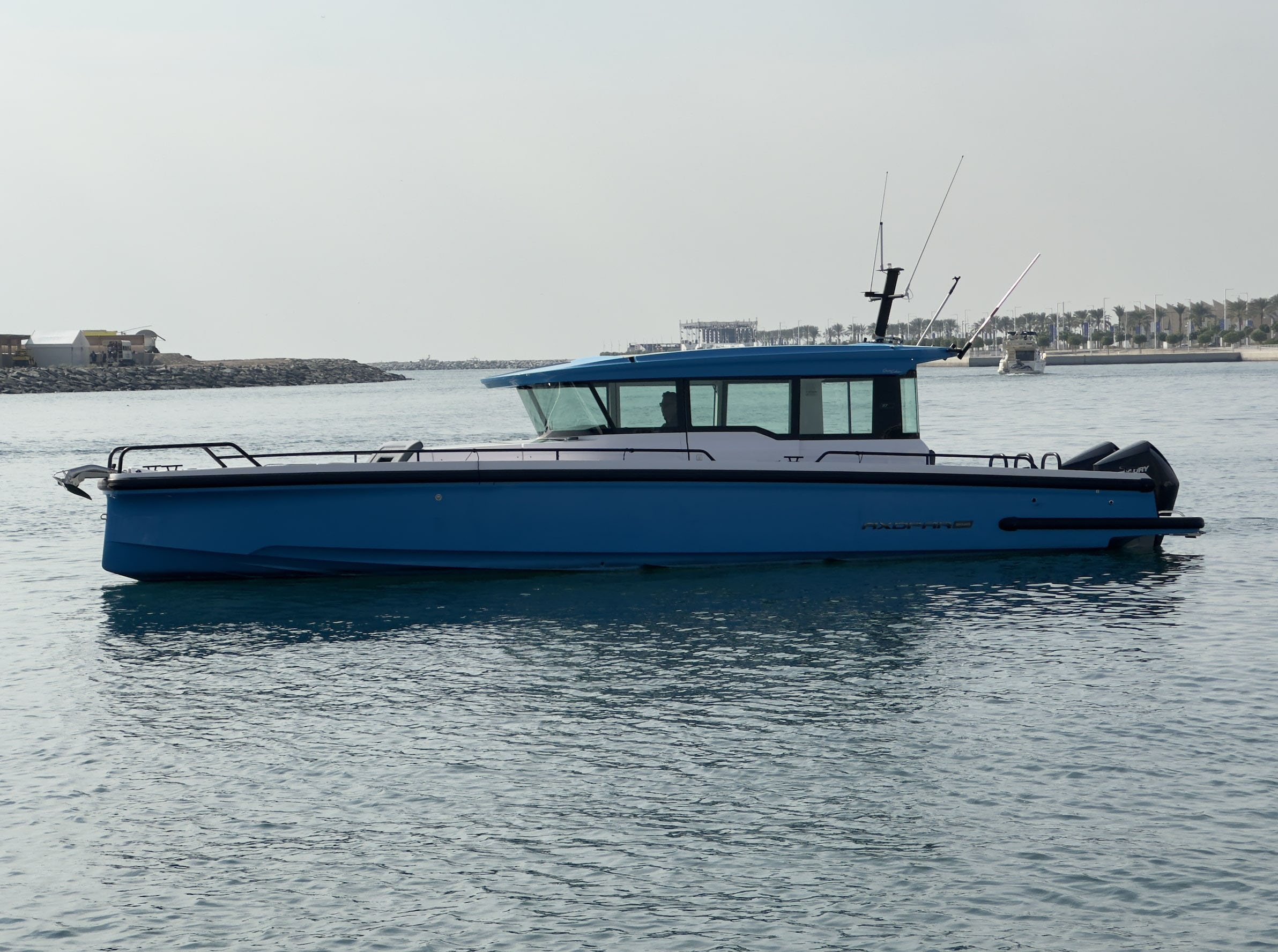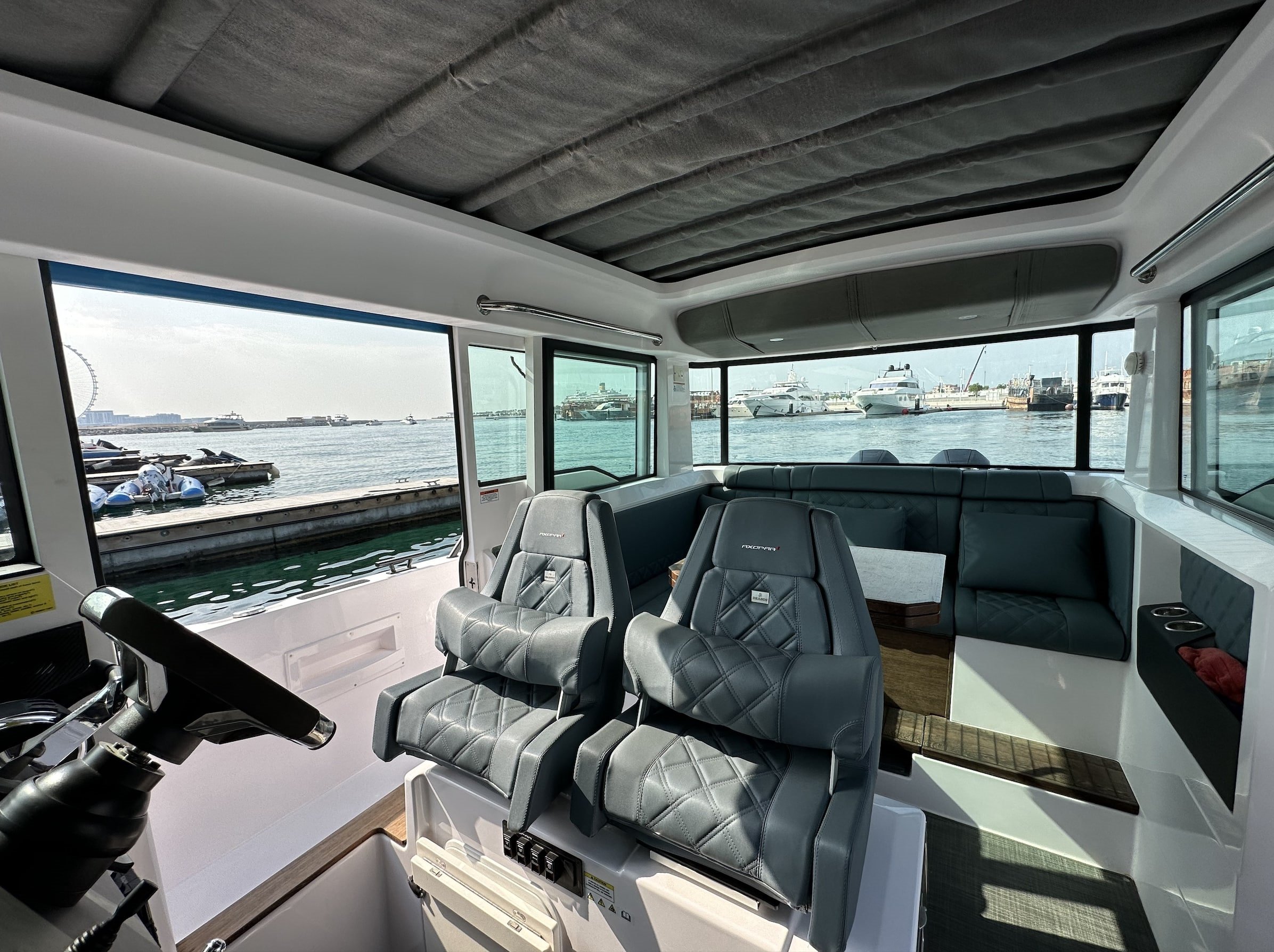 This model combines the functionality, ease of movement, social outdoor and indoor spaces and versatility of outboard walkaround centre-consoles with a spacious, fully enclosed weather proofed cabin.”