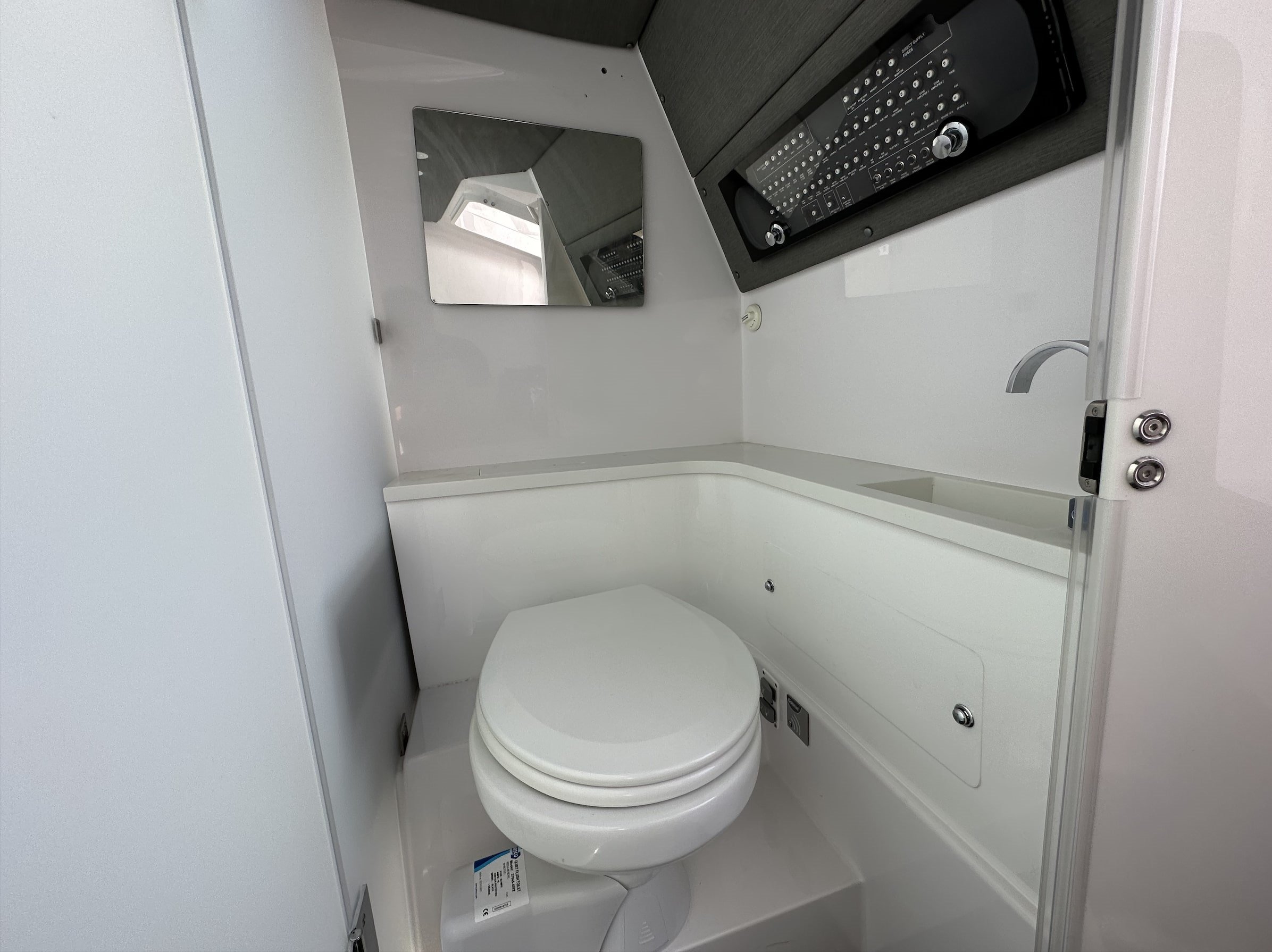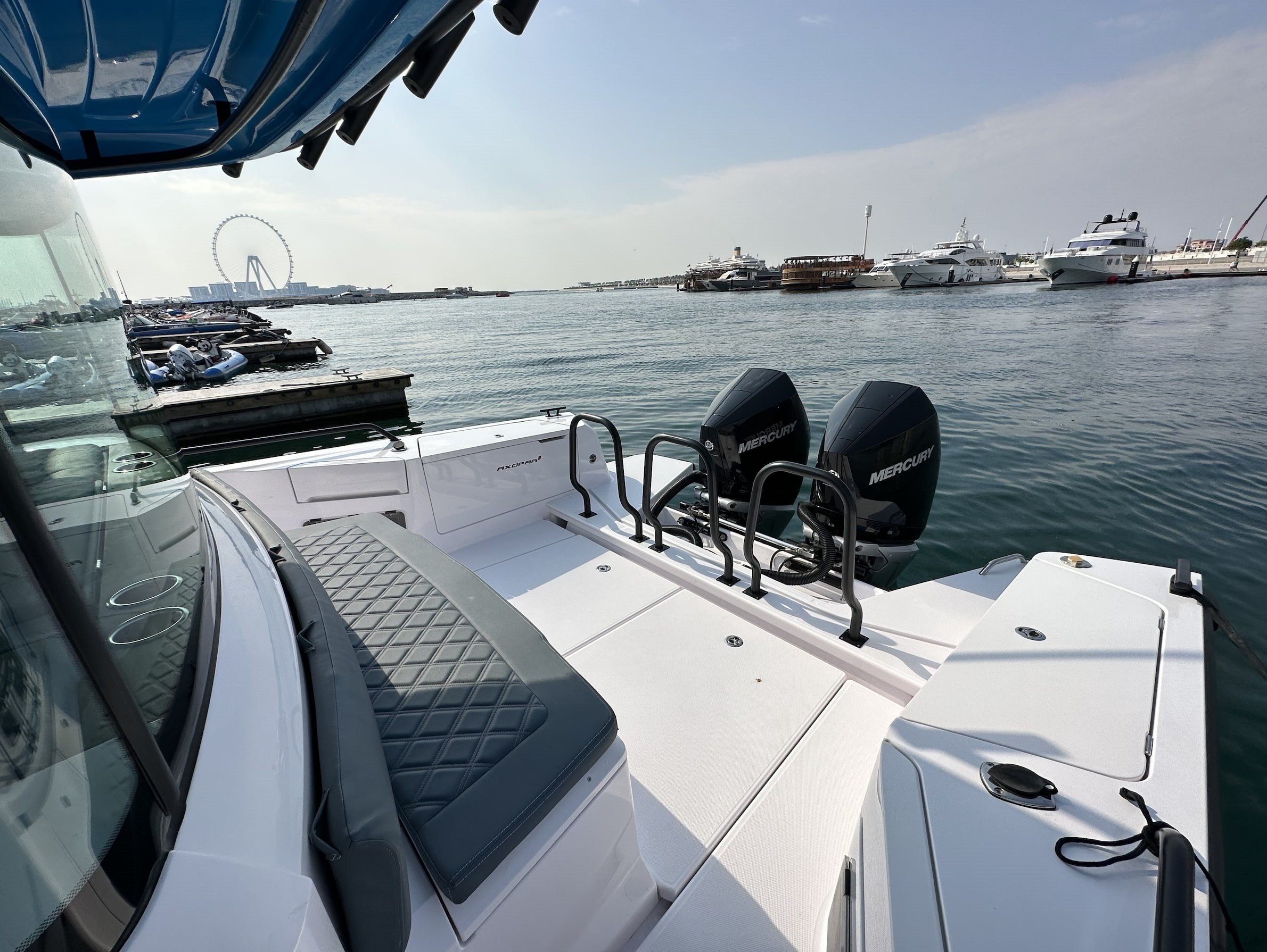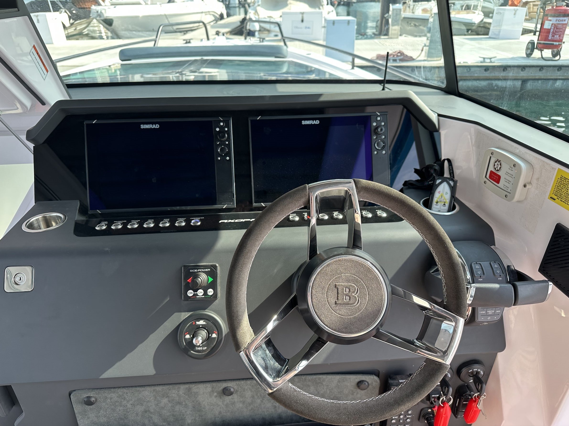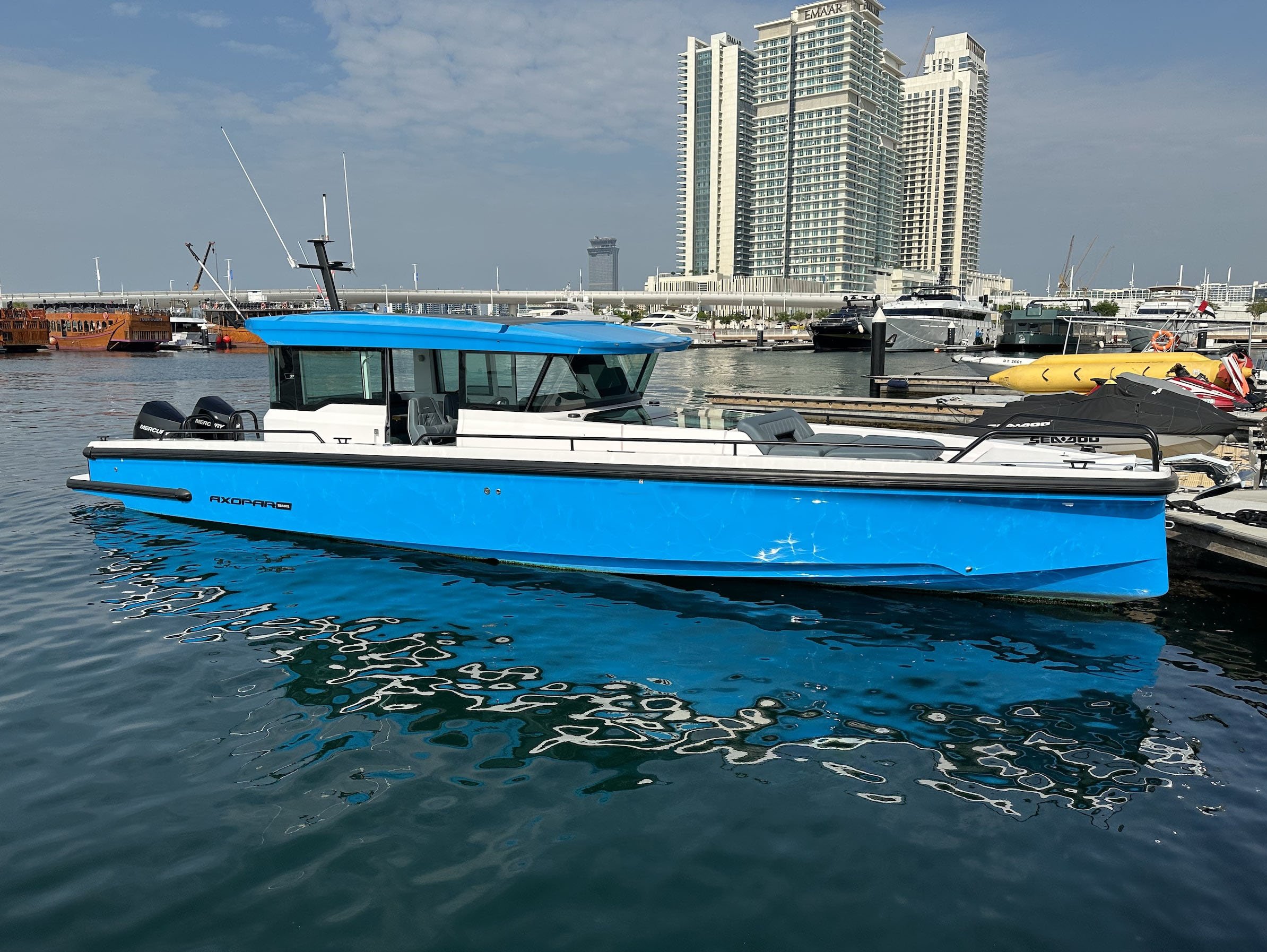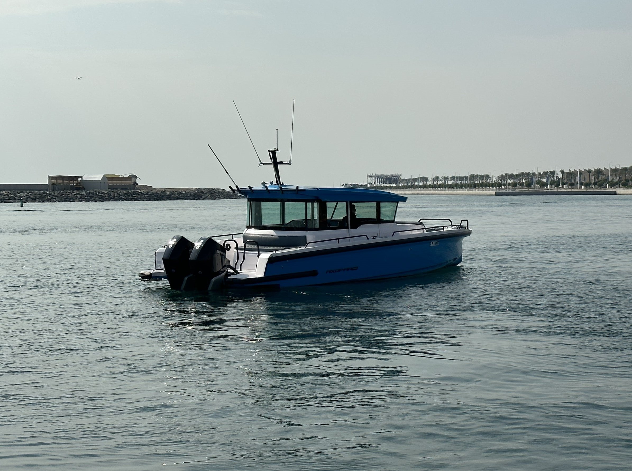 This model combines the functionality, ease of movement, social outdoor and indoor spaces and versatility of outboard walkaround centre-consoles with a spacious, fully enclosed weather proofed cabin.”