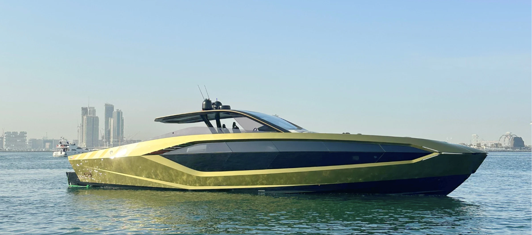 Notable features include a Seakeeper stabilizer, Webasto air conditioning, Apple TV, and a Crestron sound system. The yacht also comes equipped with two SeaBobs, a full galley, and multiple sun-lounging areas. The foredeck, cockpit, and aft sunpads provide spacious open-air zones for relaxing or entertaining. Finished in Lamborghini’s signature angular style, this yacht delivers on performance, design, and everyday usability.