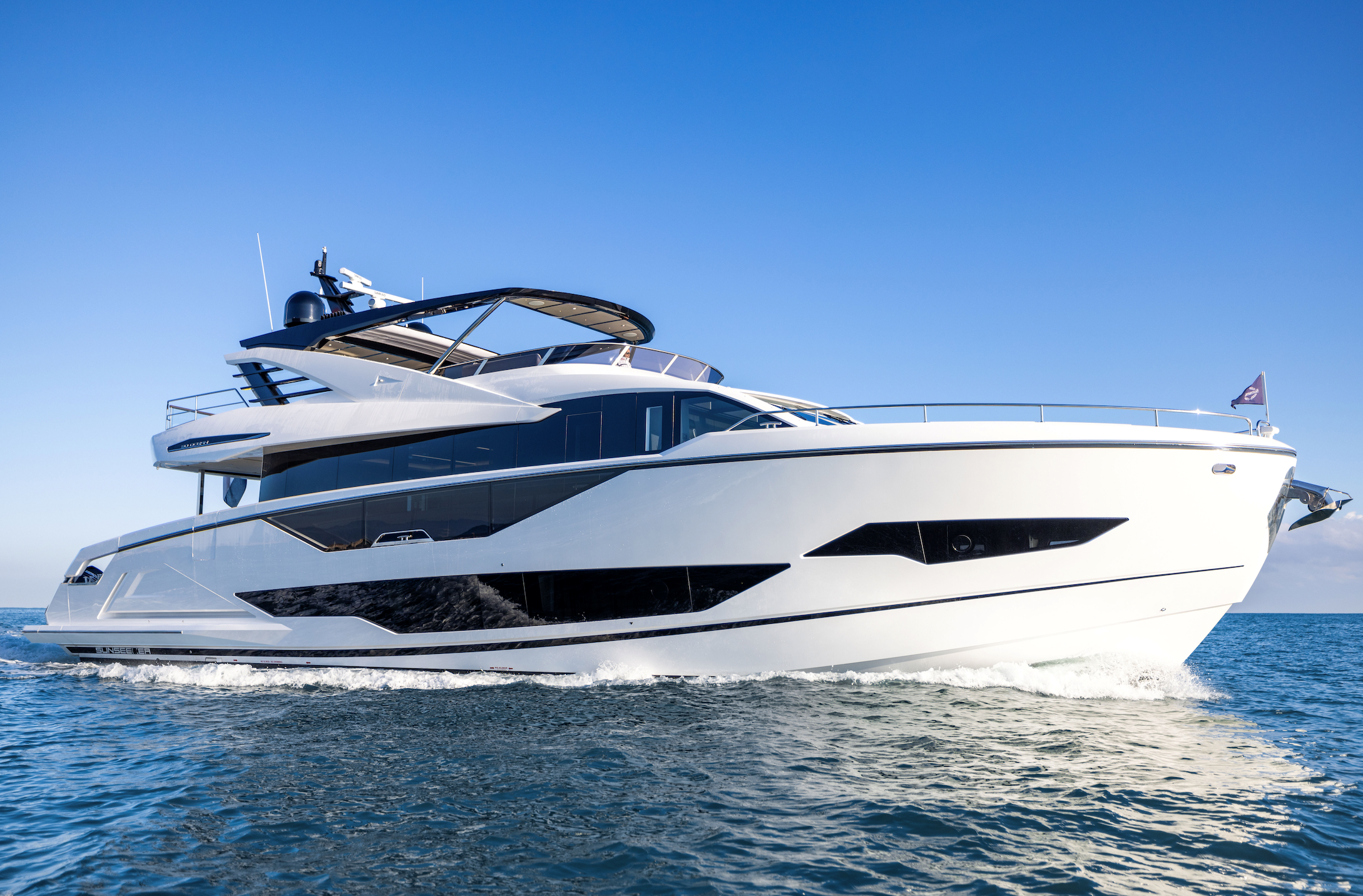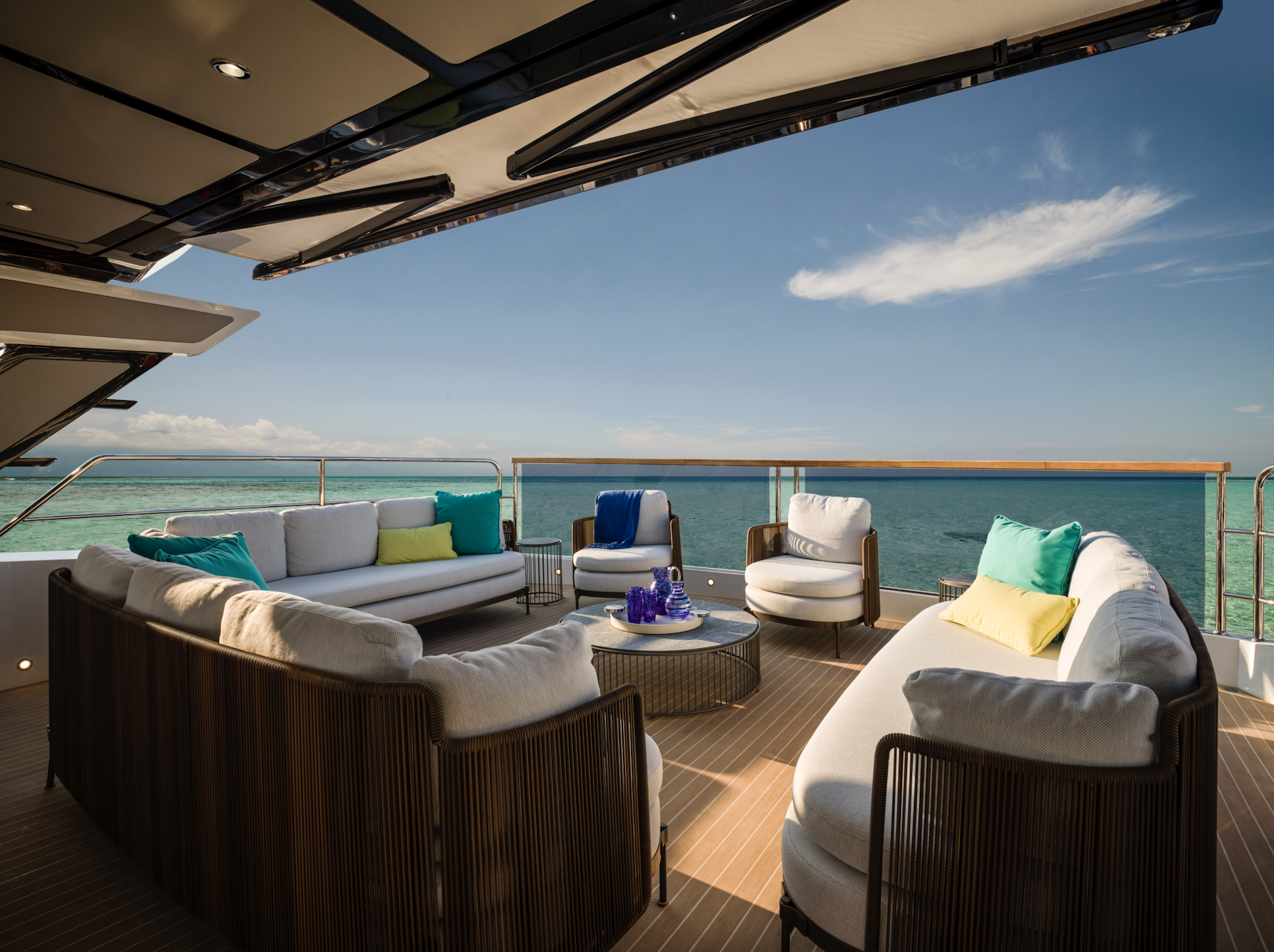 The Sunseeker 90 Ocean breaks new boundaries and creates a spectacular yacht that boasts a remarkable 20% increase in overall volume and nearly 30% more deck space, thanks not only to her substantial beam but also her upright bow that brings interior volume forward. The spacious Beach Club measuring over 6m x 4m is perfect for family and friends to socialise close to the water, perhaps utilising the built-in BBQ. The Bezenzoni ‘Ladder Gangway’ allows guests to effortlessly access the watersports on offer, after which they will be keen to use the oversized ‘rain shower’ before relaxing on the new transformational X-TEND™ sunbeds.