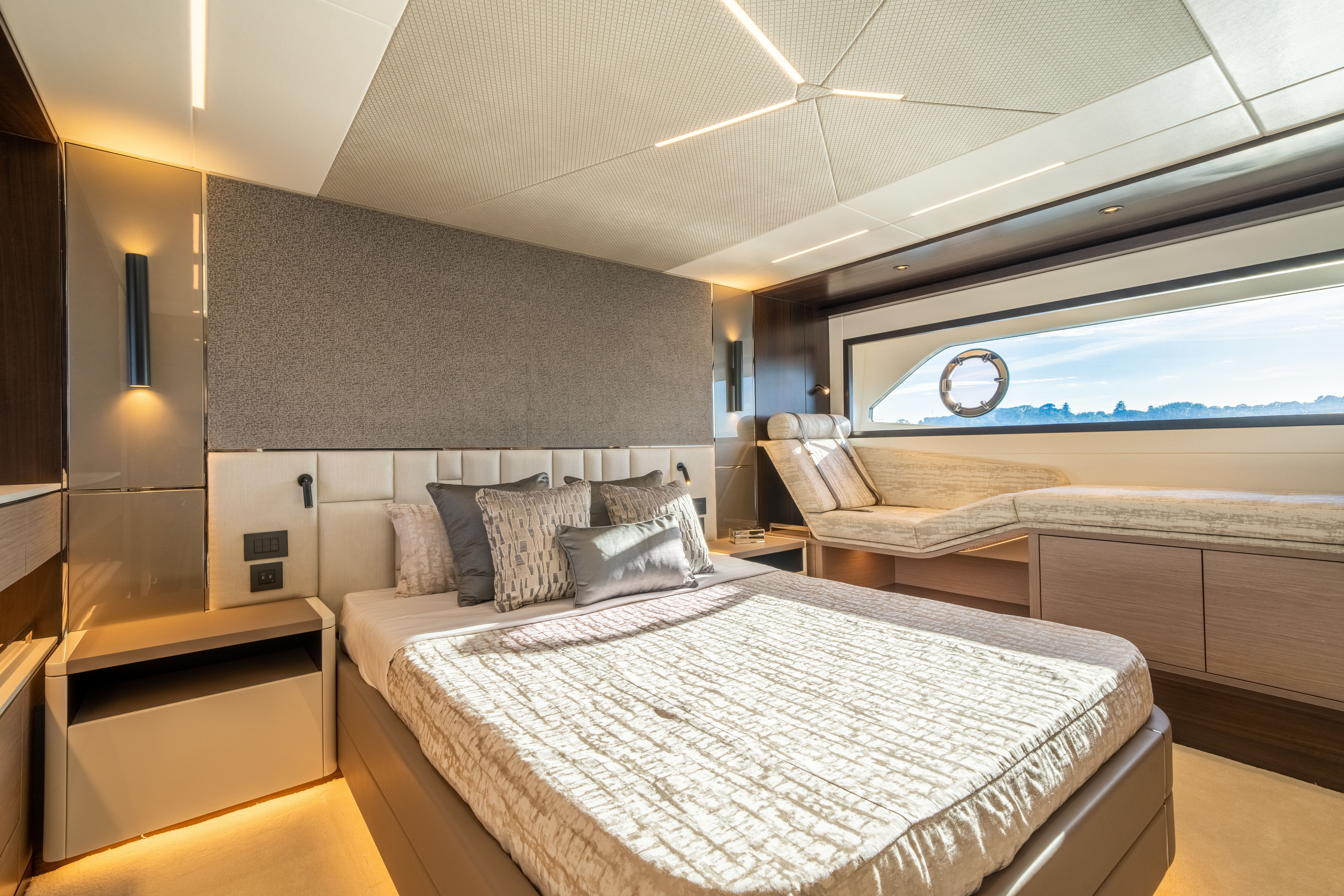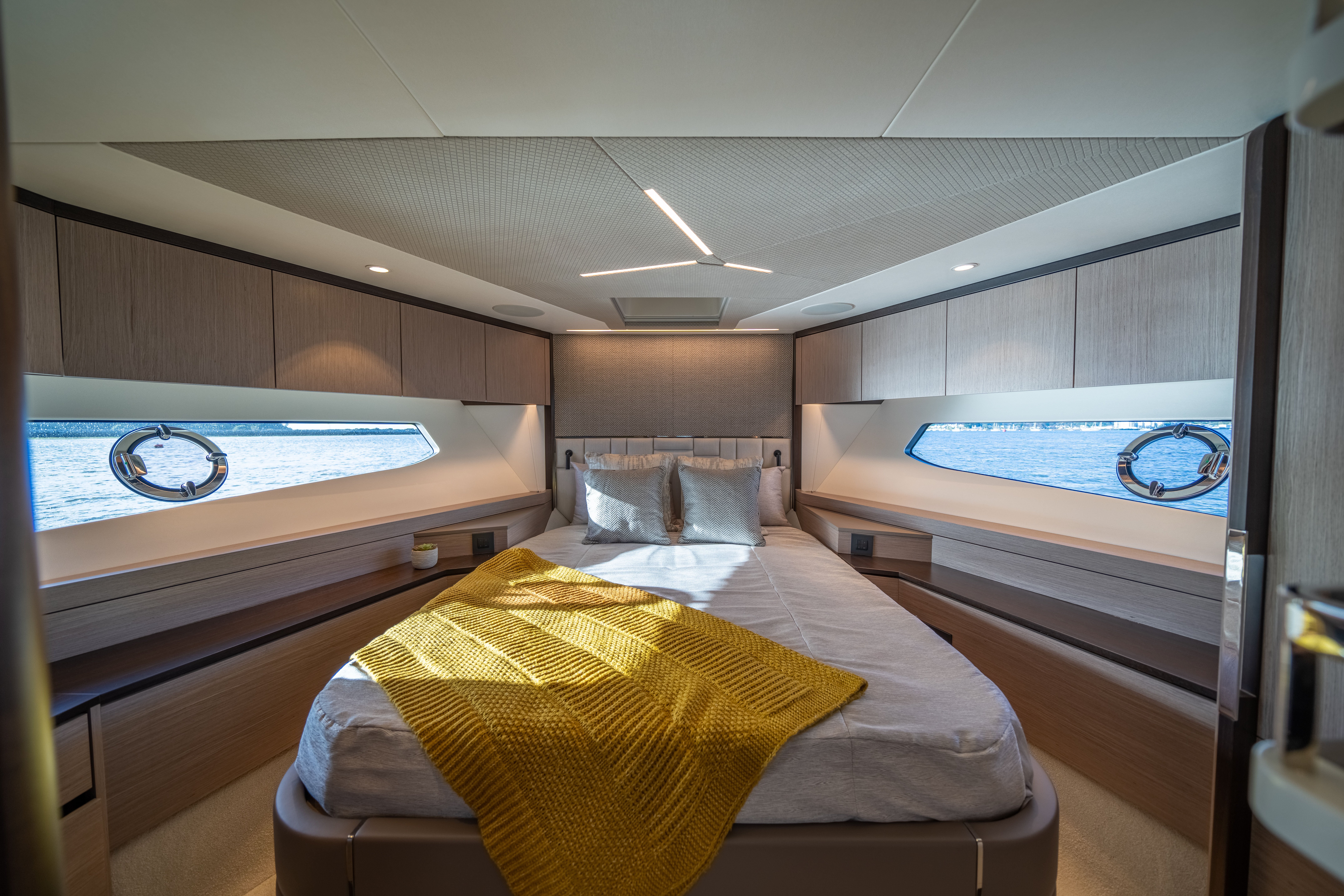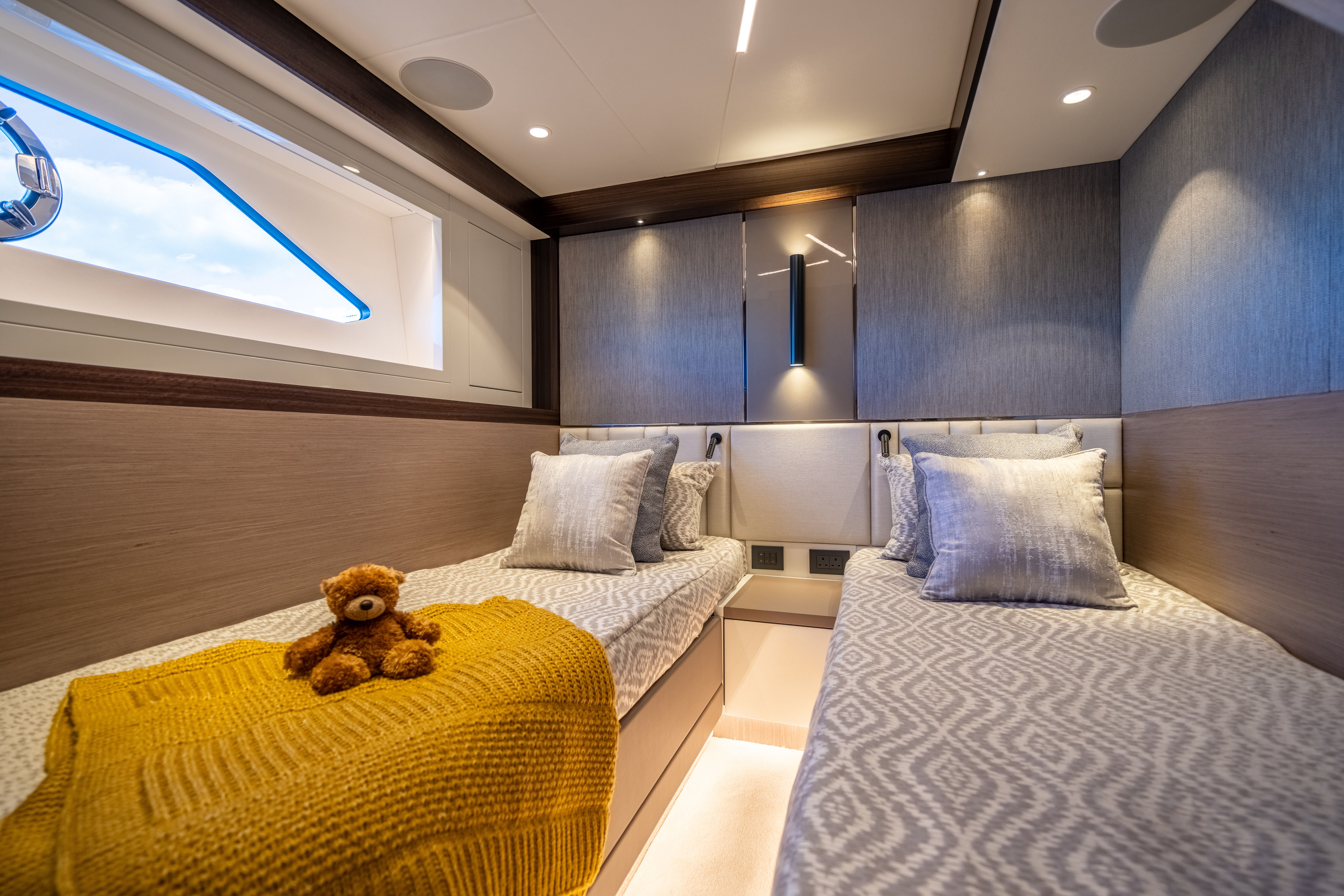 The fully-equipped aft galley with a large dinette links seamlessly to the cockpit via full-width sliding doors, helping to bring everyone together. The innovative design layout allows owners to welcome guests with a strong focus on ambient lighting and interior detailing. Access to the spacious guest cabins is via the lower helm and elevated companion seating, whilst the sumptuous master cabin amidships is accessed via its very own staircase to port. This exceptional layout allows the owner and guests to move effortlessly between spaces. The interiors boast exquisite attention to detail with a new palate of upholstery that provides a cool, crisp, and contemporary look, unmistakably a Manhattan.