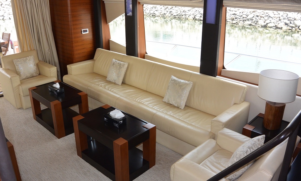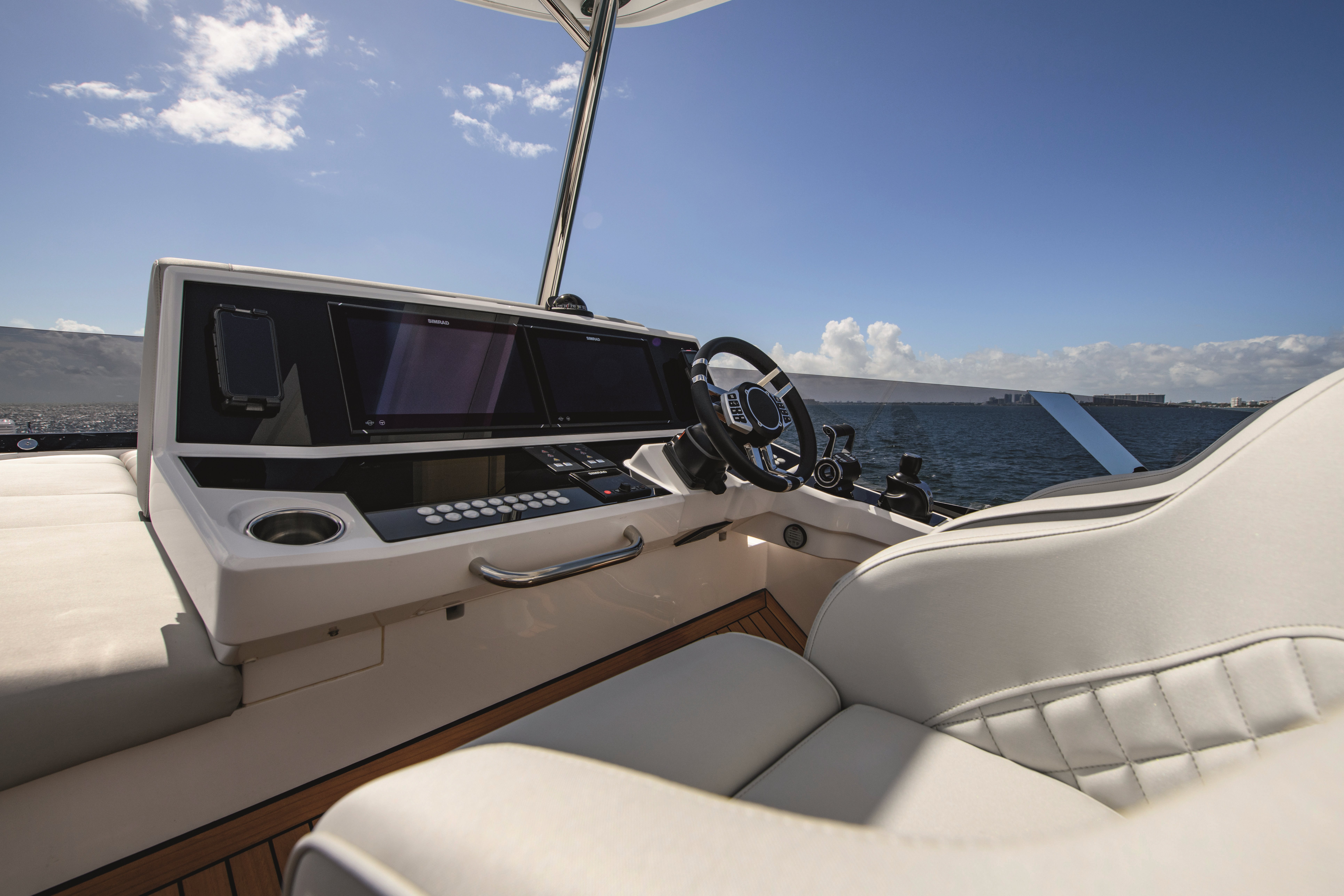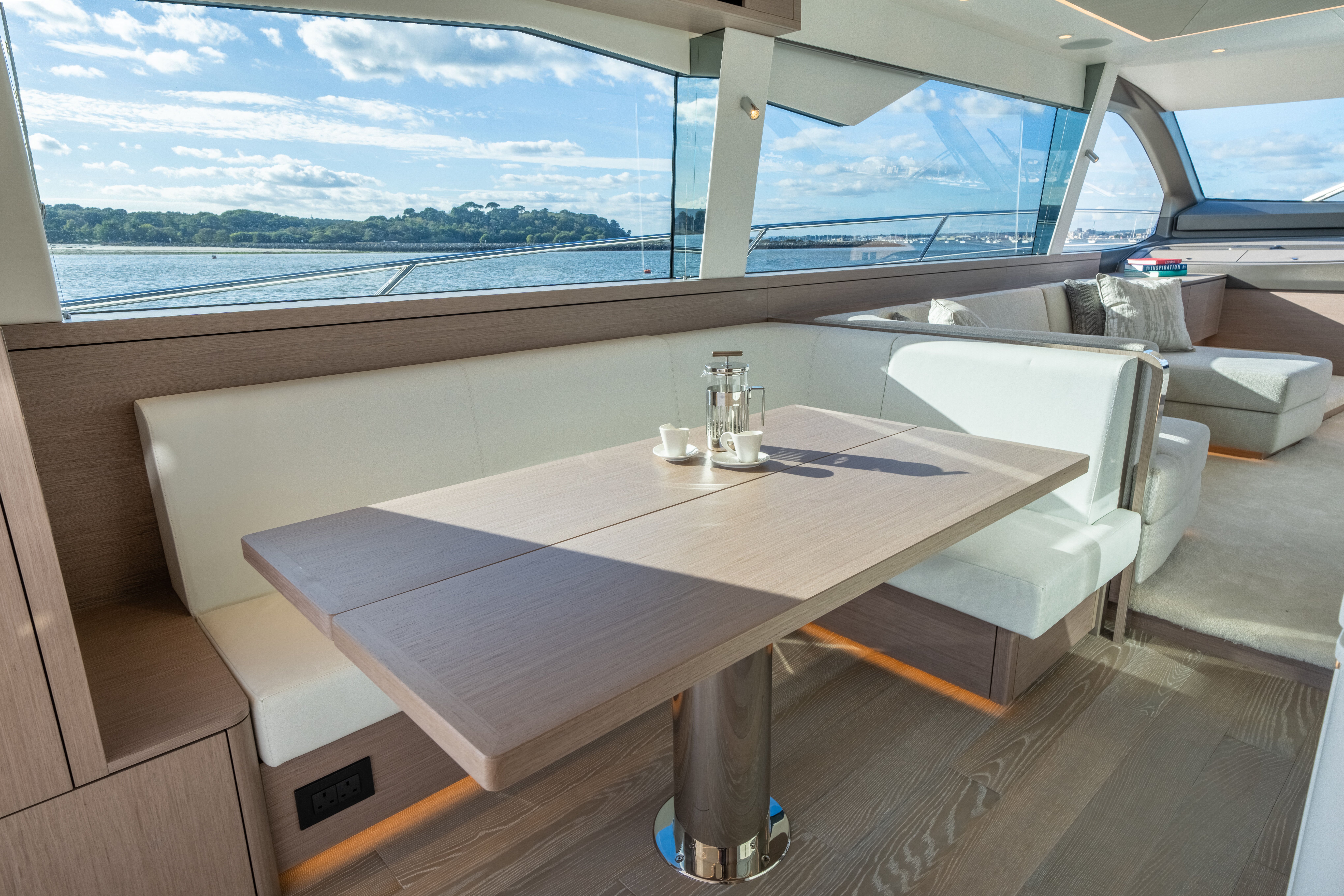 The fully-equipped aft galley with a large dinette links seamlessly to the cockpit via full-width sliding doors, helping to bring everyone together. The innovative design layout allows owners to welcome guests with a strong focus on ambient lighting and interior detailing. Access to the spacious guest cabins is via the lower helm and elevated companion seating, whilst the sumptuous master cabin amidships is accessed via its very own staircase to port. This exceptional layout allows the owner and guests to move effortlessly between spaces. The interiors boast exquisite attention to detail with a new palate of upholstery that provides a cool, crisp, and contemporary look, unmistakably a Manhattan.