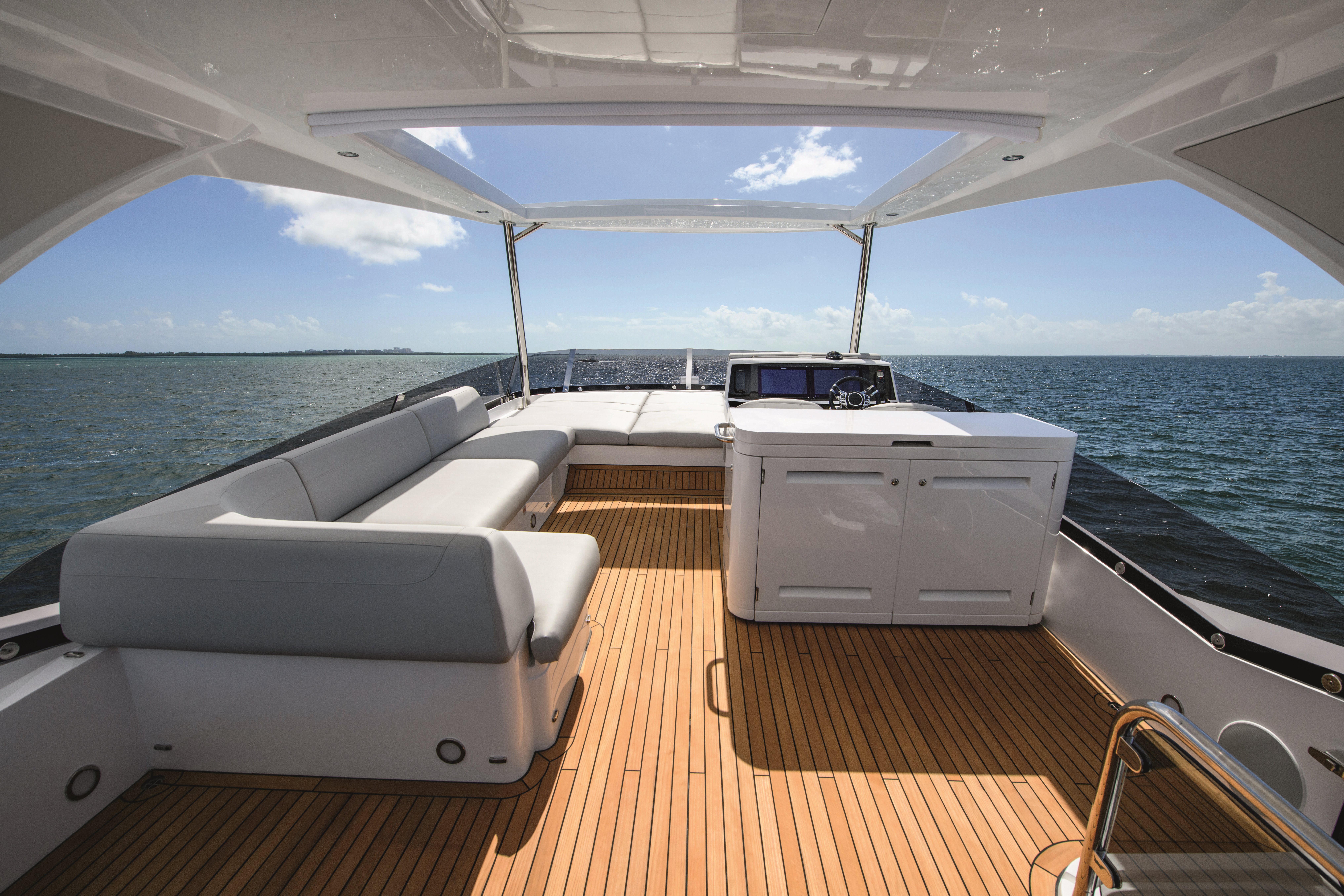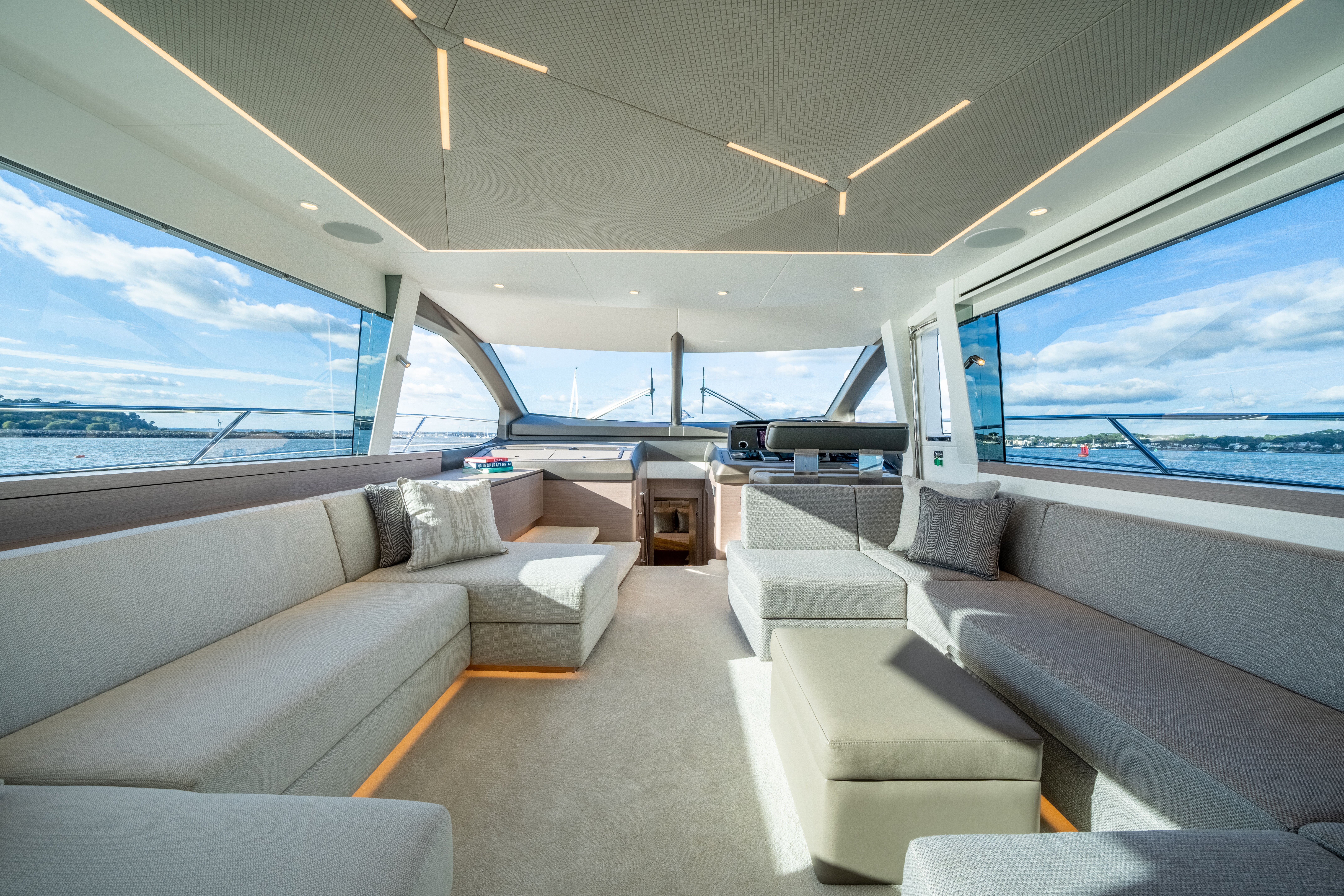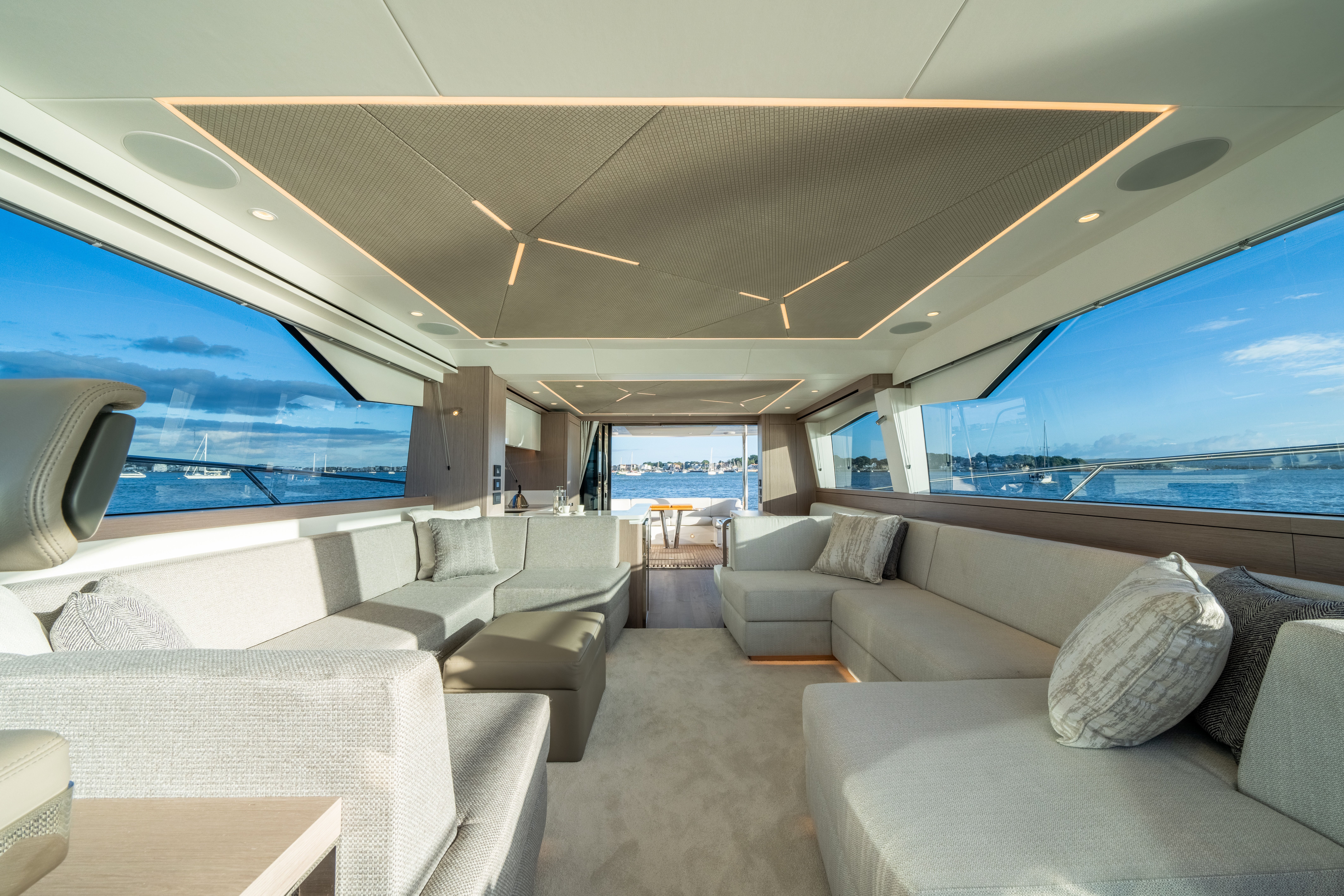 Built upon the exceptional family of award-winning Manhattan models, the Manhattan 68 offers an extraordinary level of comfort and luxury with incredible detailing. Throughout the main deck, there is a strong focus on creating generous, usable sociable spaces. The exterior lines flow effortlessly from the Portuguese-bridge bow seating and sunbathing areas to the expansive cockpit adjoining an innovative Beach Club with enhanced features, including a dedicated water level locker for two SeaBobs, delivering effortless enjoyment. Internally, the expansive main saloon benefits from sweeping glazing, extending below the TV console, revealing glimpses of the sea from all perspectives.