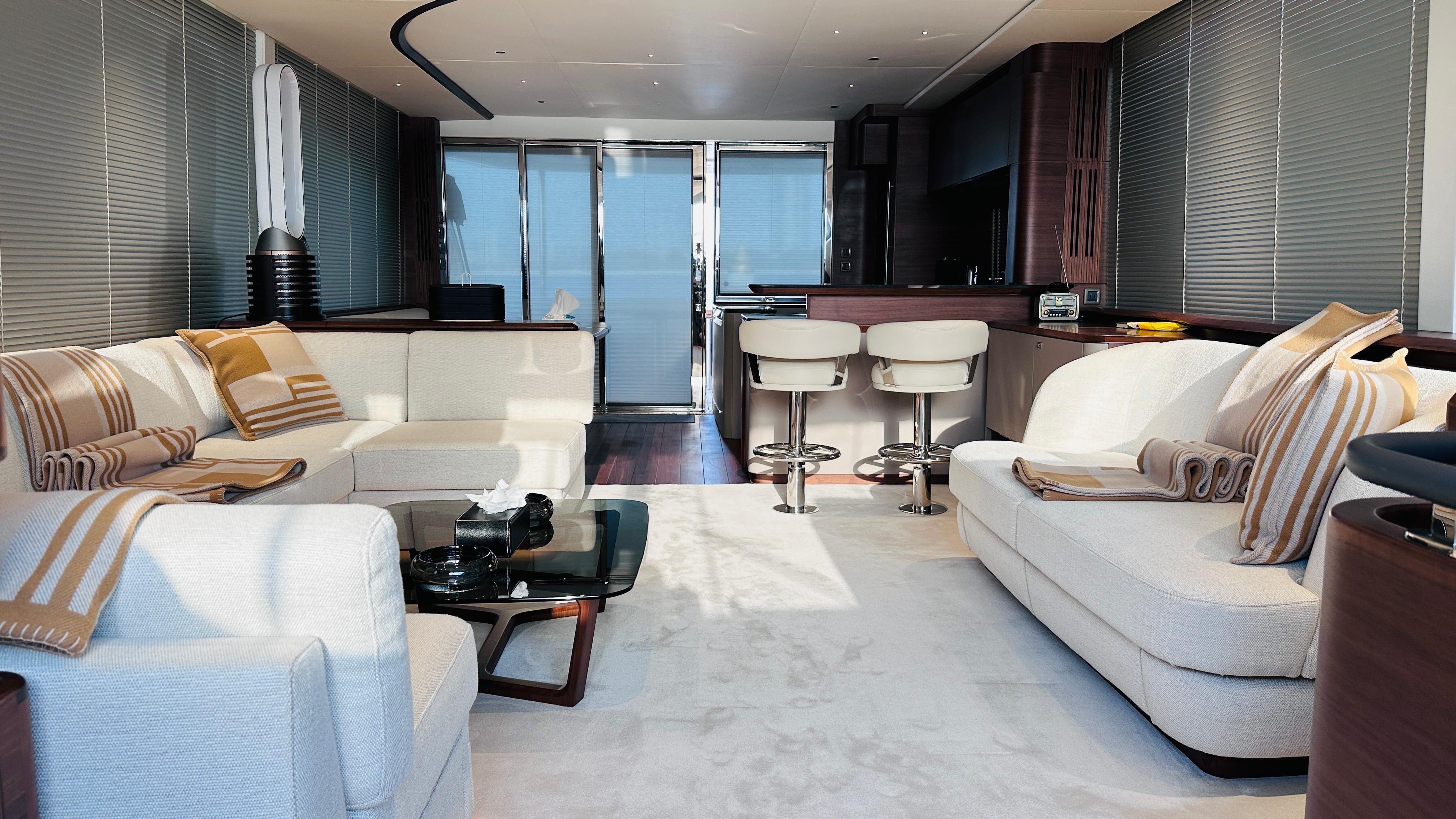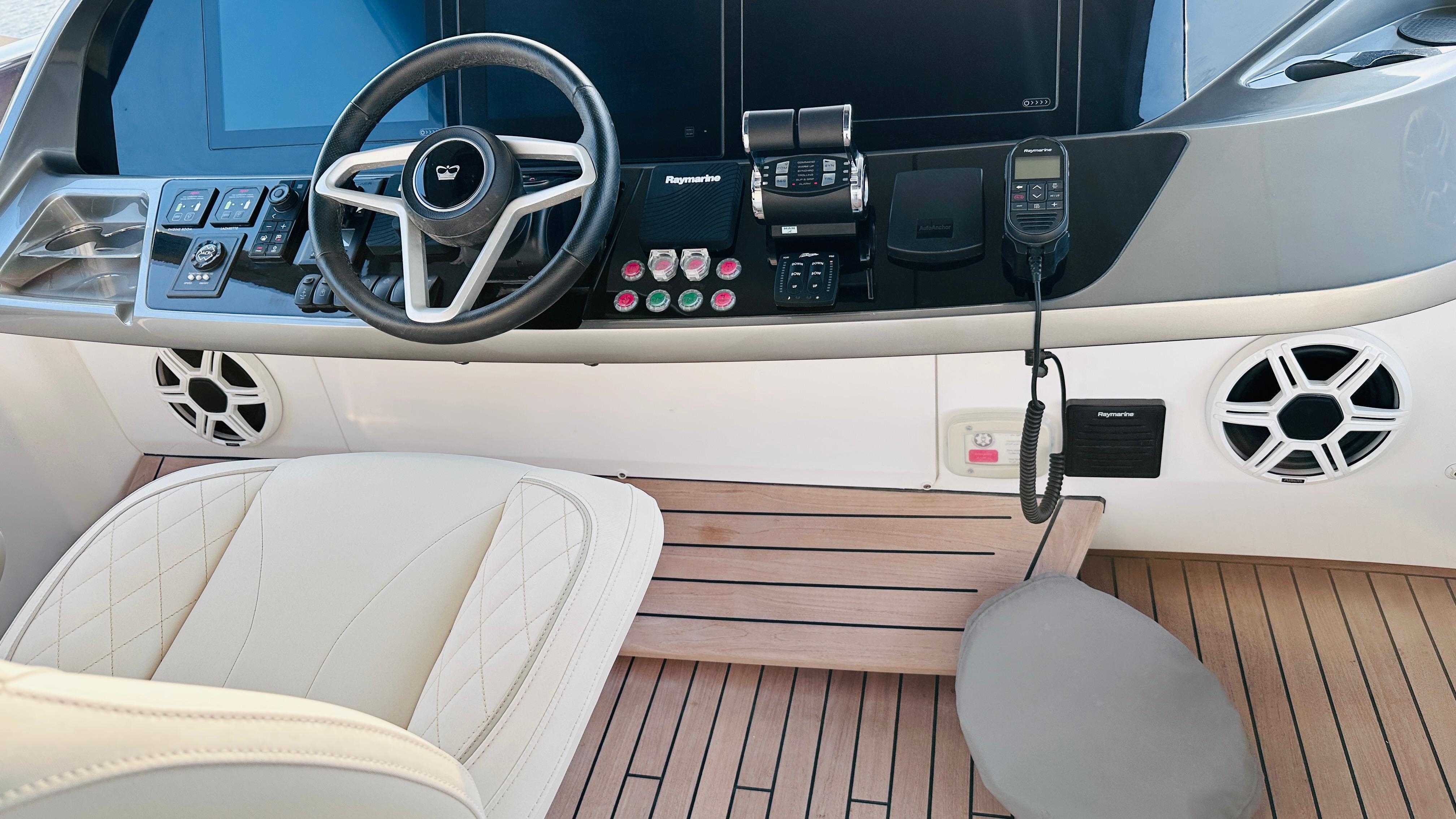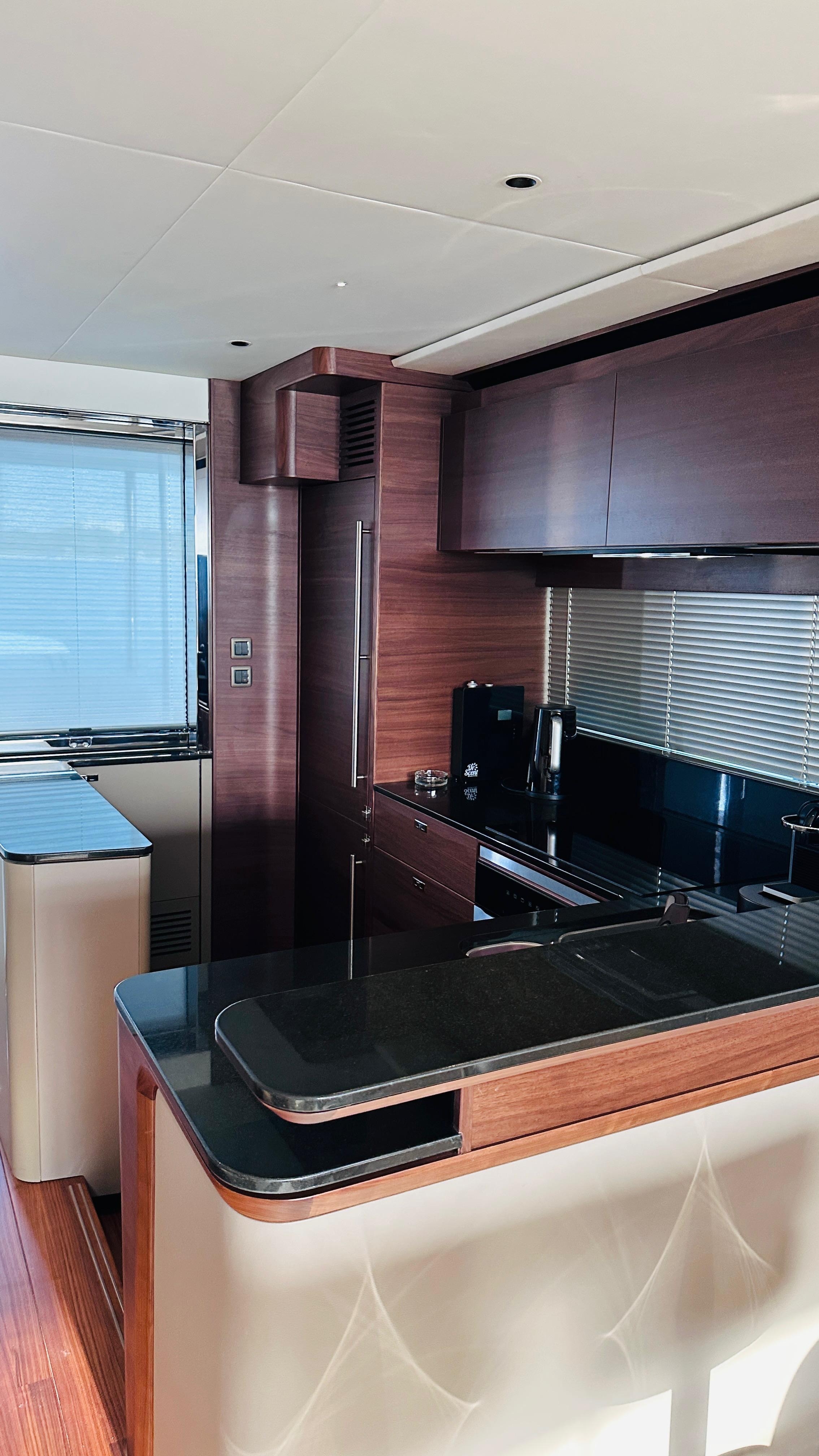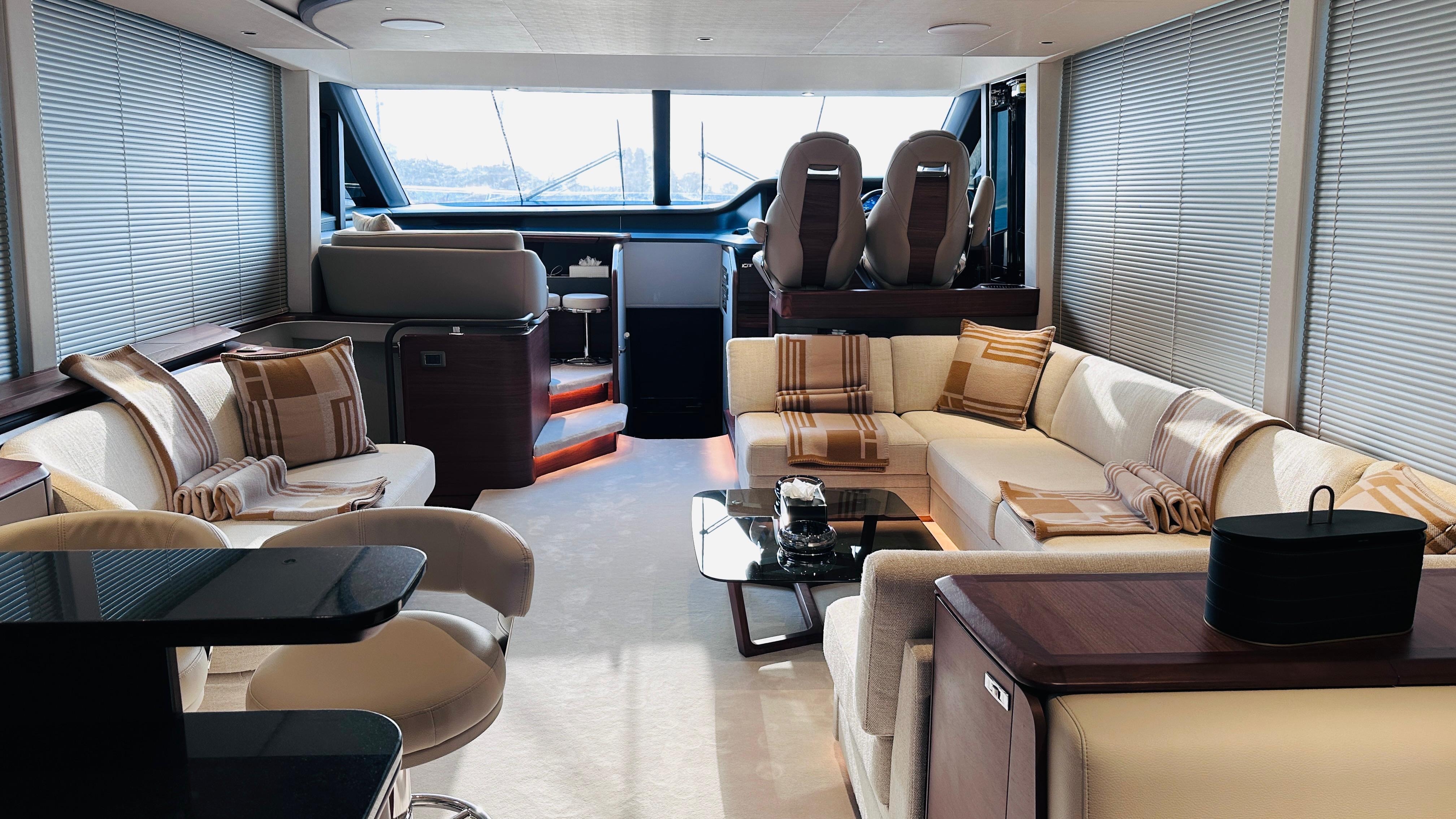 The 2025 Princess Y72 is finished to high standards throughout; the all-new Y72s design features are comparable to those of larger Y Class yachts. Her spacious saloon has a sociable layout with a bar area and open-plan galley, complemented by a multi-zone Naim audio system.