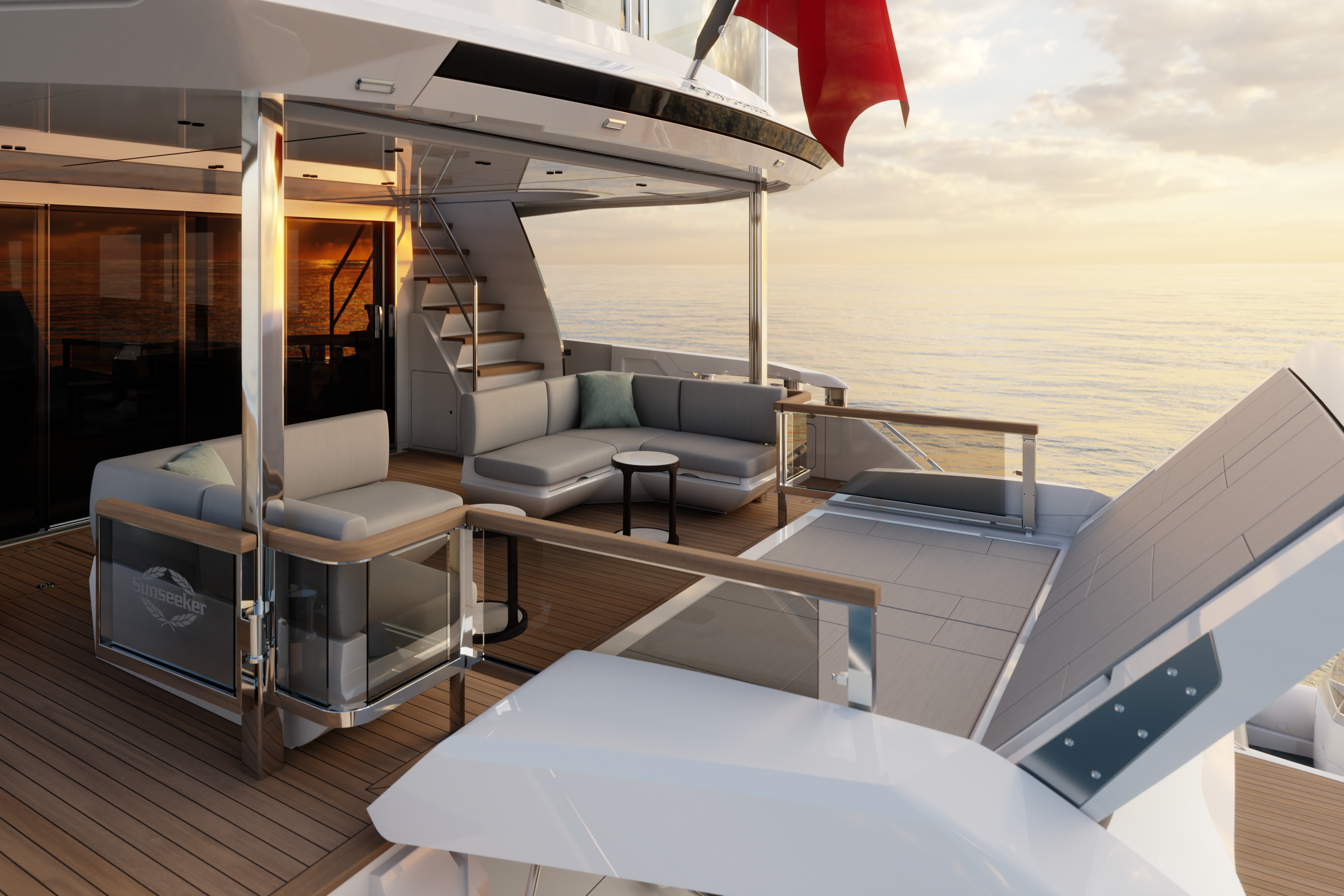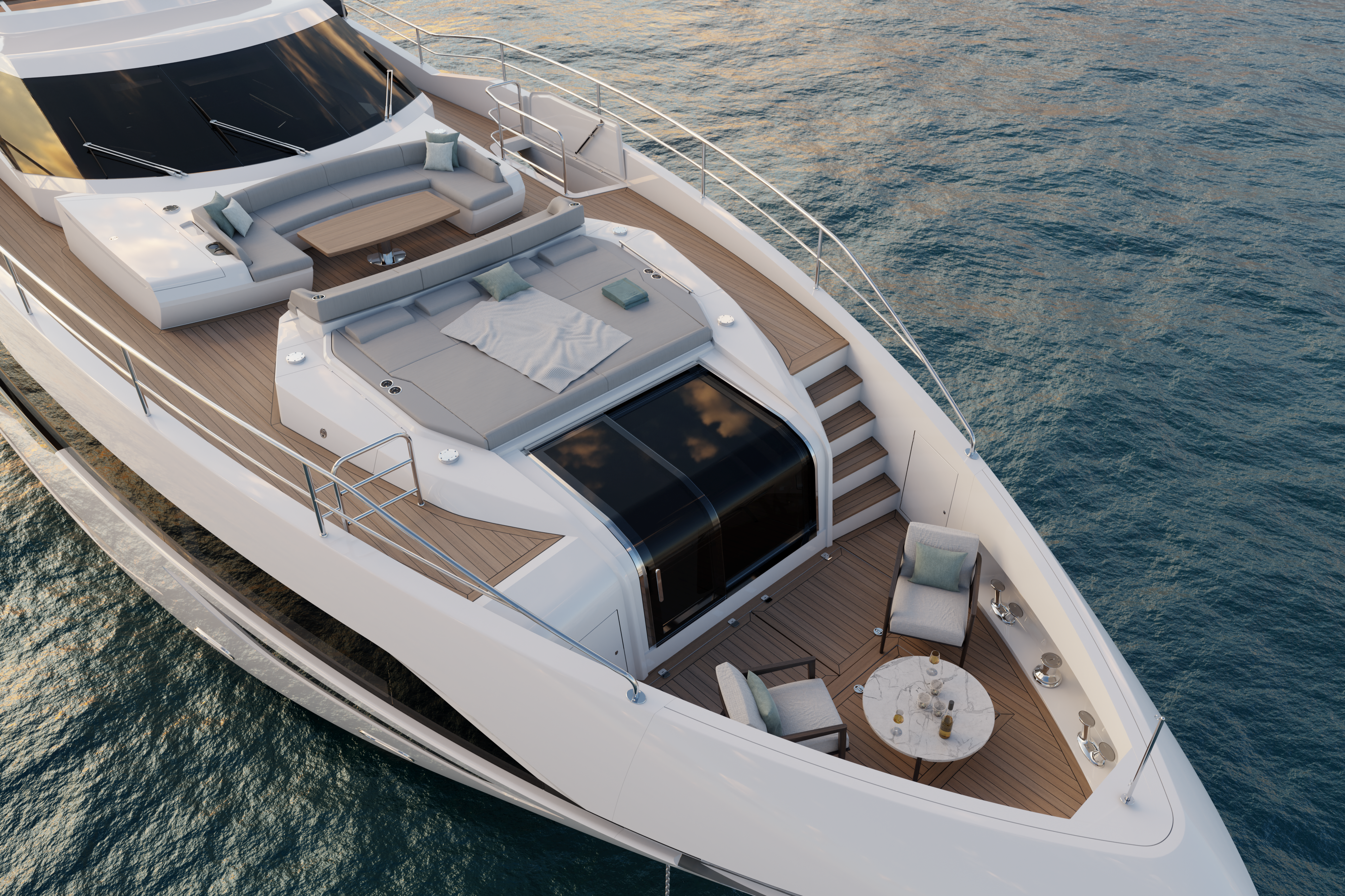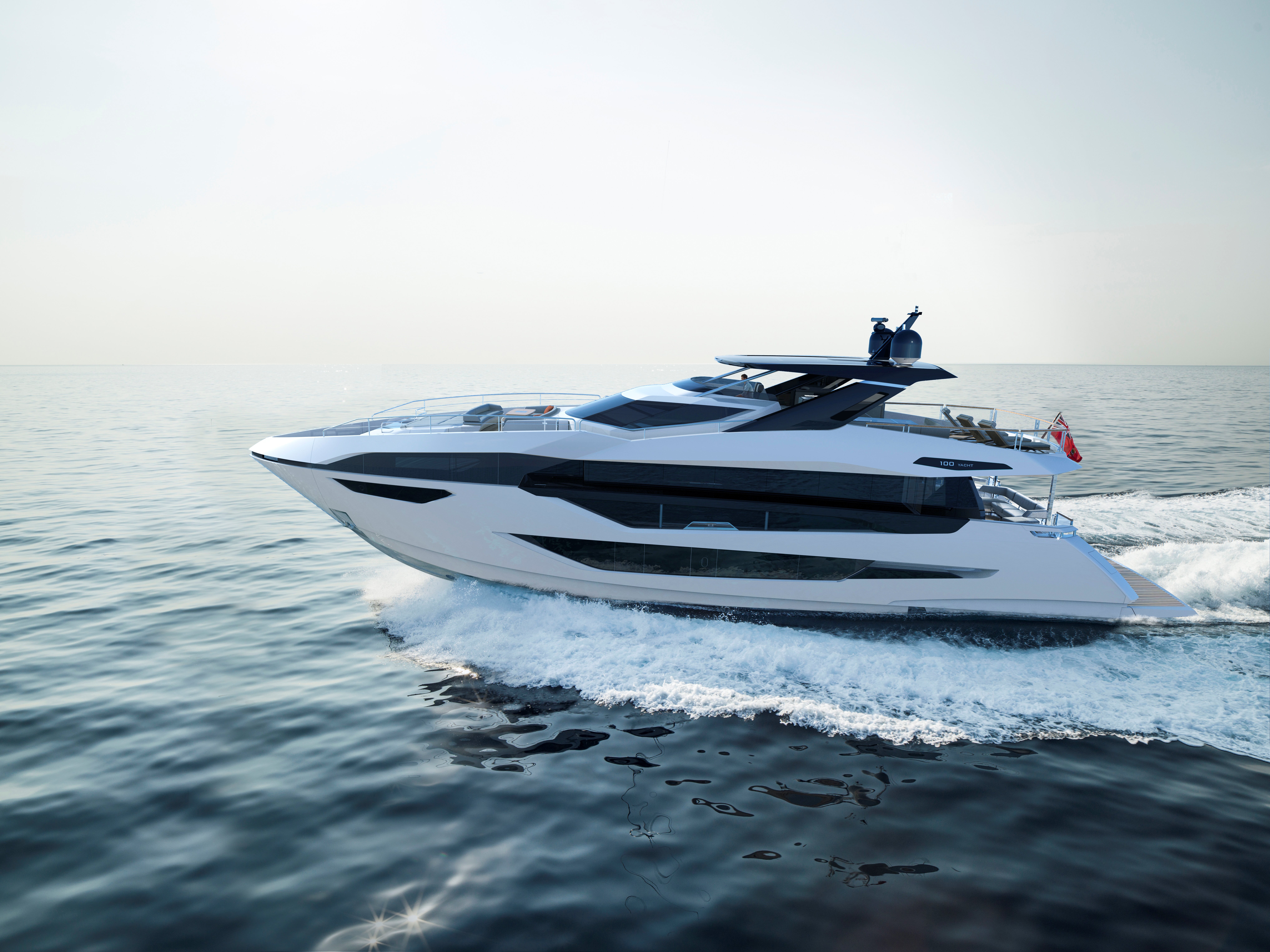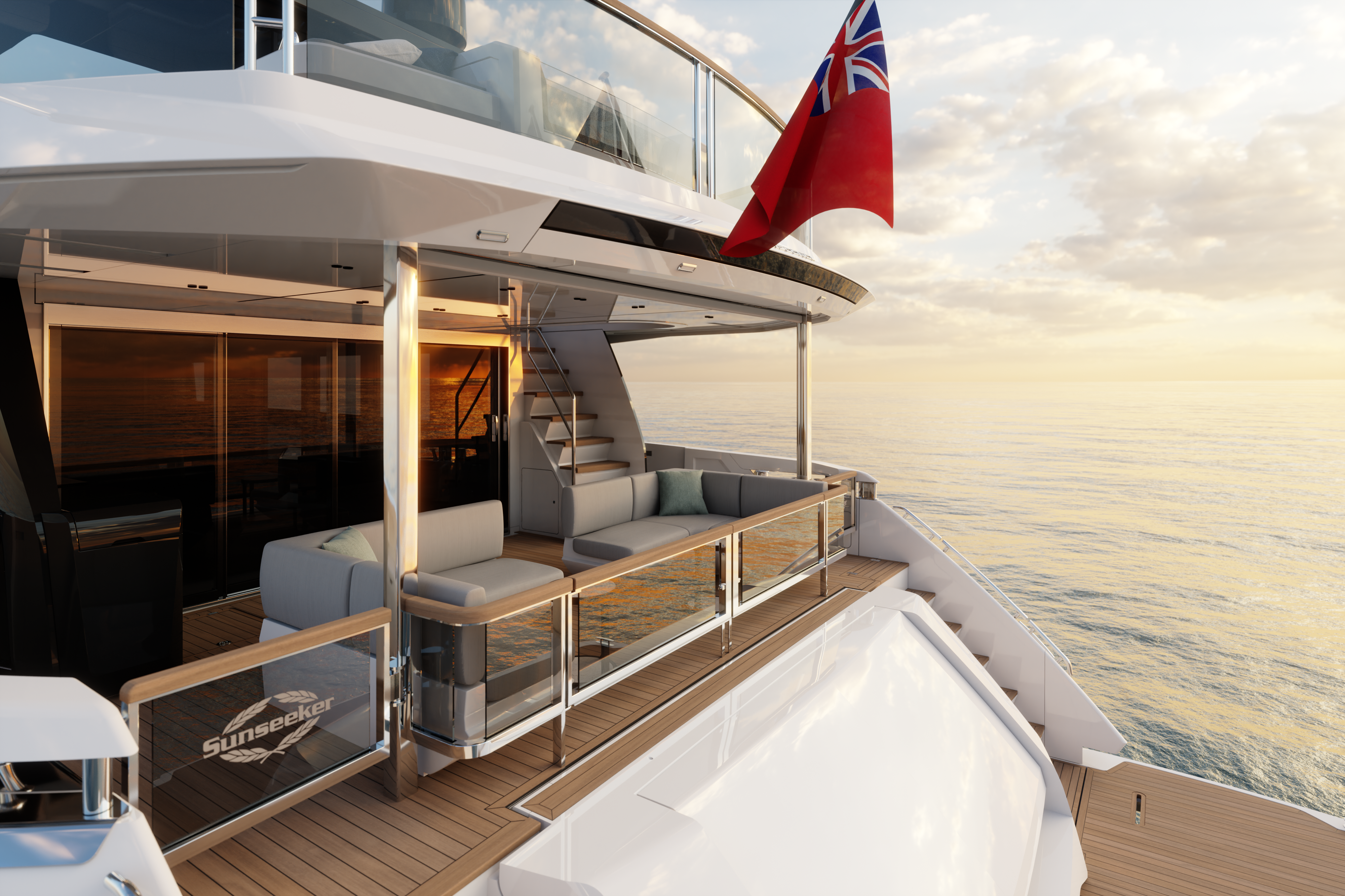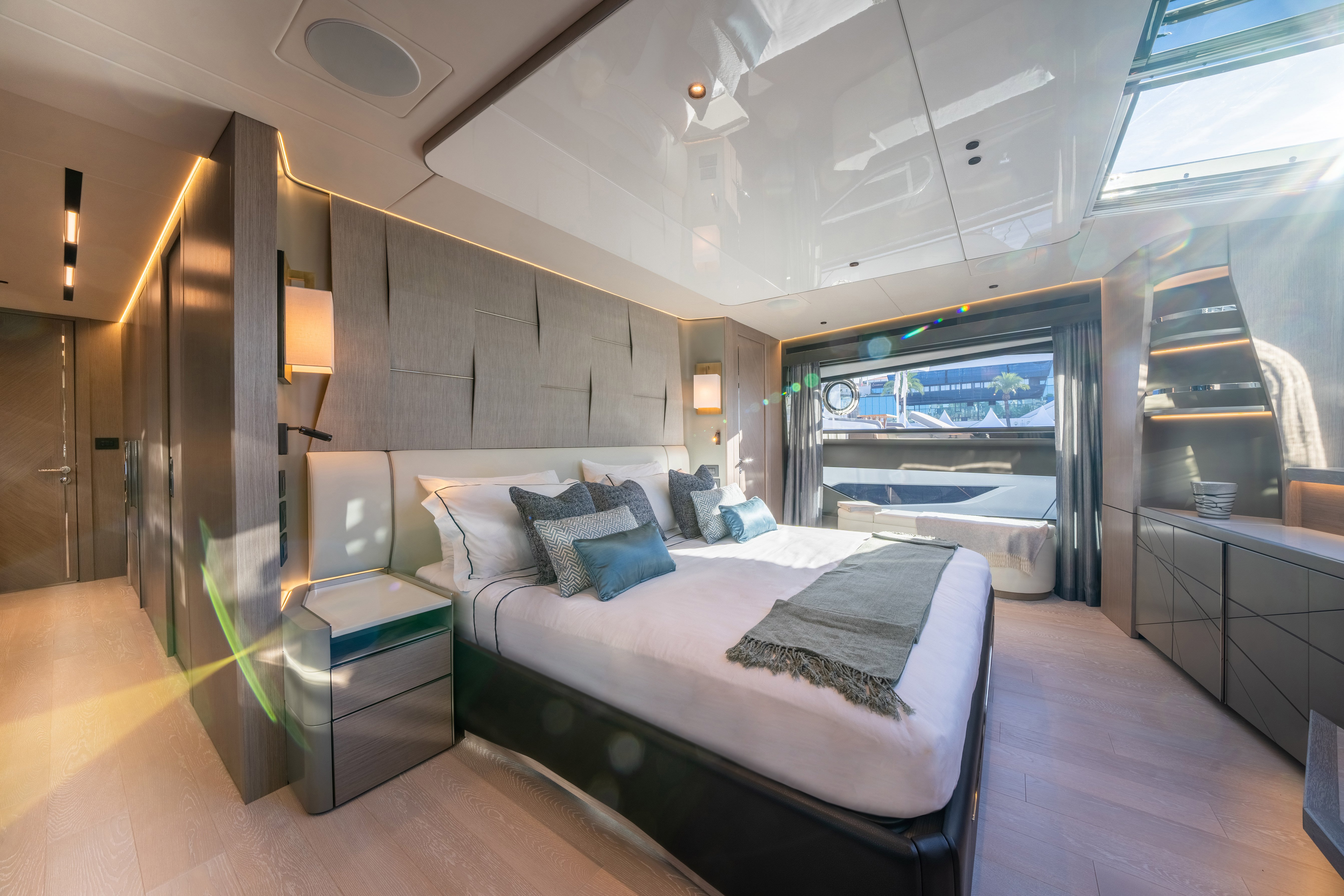 The Sunseeker 100 Yacht is set to surprise and delight at every turn. Every element has been carefully considered in meticulous detail, exuding sophistication found in custom superyachts. Her elegant, powerful lines flow around sublime architecture. A secluded private terrace, sunbathing hideaways, seamless flybridge with foredeck access, beautifully proportioned open-plan interior and generous ‘Beach Club’ are just a few of her magnificent features. Its unique main deck, penthouse-style saloon and luxurious staterooms offer a new-found design direction and material selection providing elegant interiors to enchant any owner. The layering of textural elements and the mix of furnishings and fabrics feels timeless with a sophisticated aesthetic.